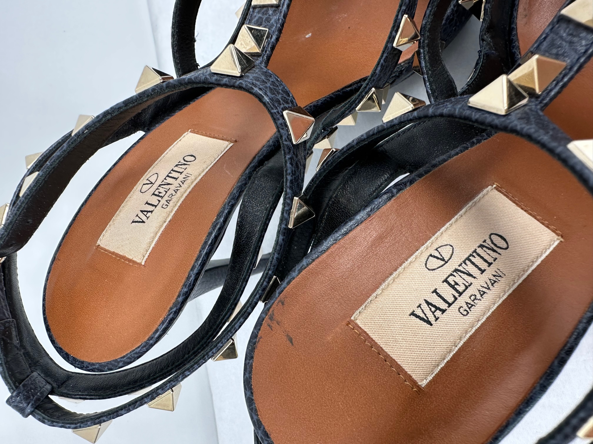 "granatowe szpilki, skóra stylizowana na aligatora, paski wysadzane złotymi ćwiekami, zapięcie w kostce, stan bardzo dobry, zelówka, pudełko i worki przeciwkurzowe w zestawie. Rozmiar 39,5. Wys. obcasa 11 cm."