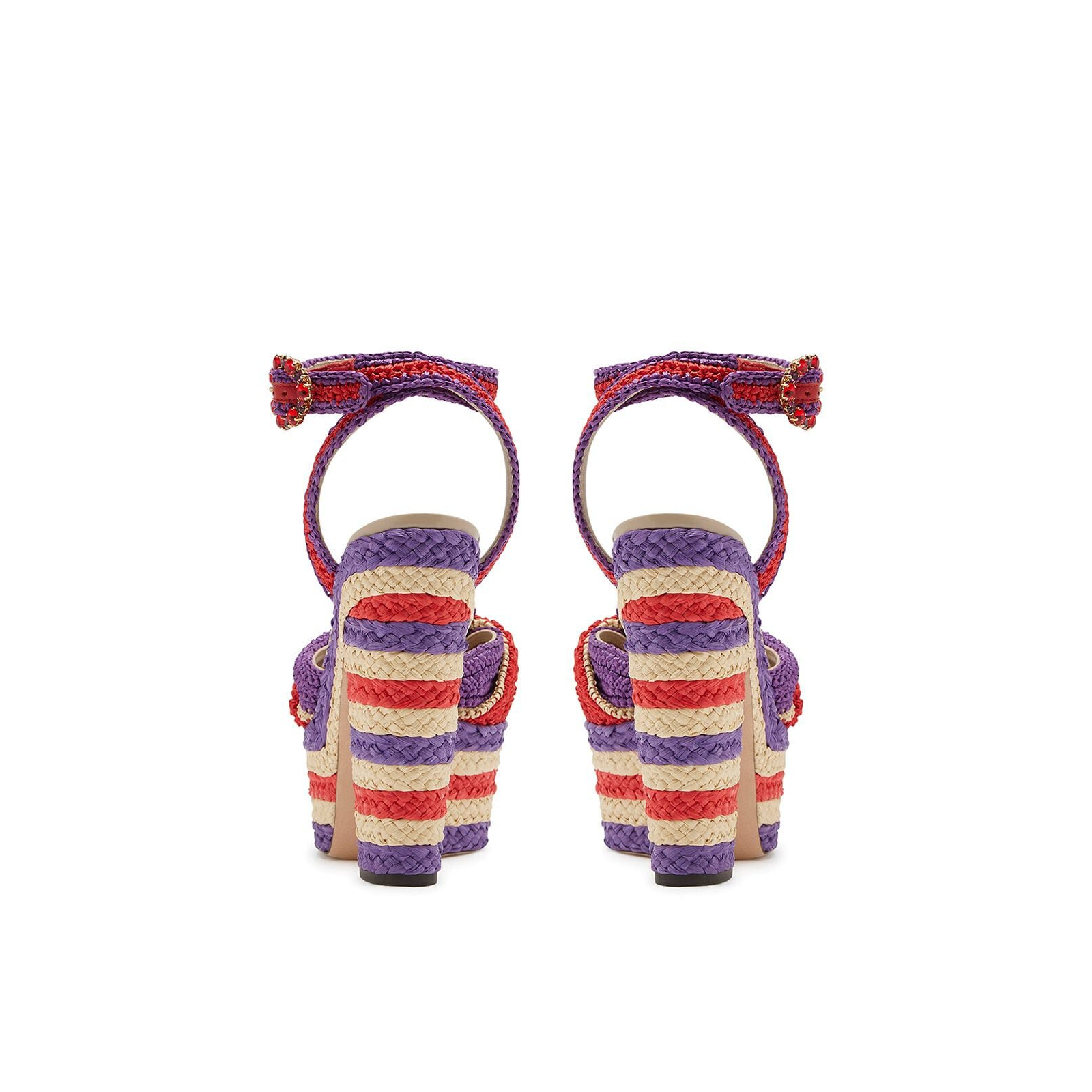 "sandałki z rafii w kolorach fioletowo-czerwono-beżowym, obcas słupkowy i platforma, zapięcie wokół kostki z ozdobną klamrą wysadzana cyrkoniami, stan idealny, worek przeciwkurzowy w zestawie. Rozmiar 38, wys. obcasa 15 cm, wys. platformy 5,5 cm."