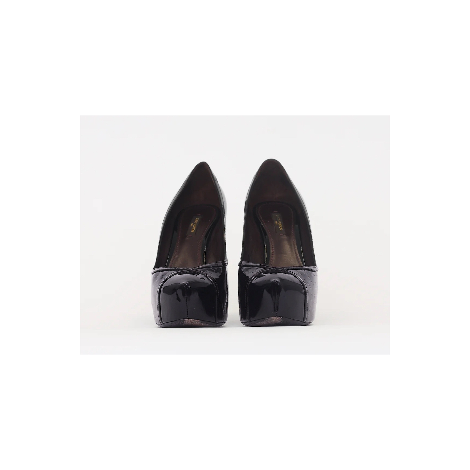 "Buty na wysokim obcasie oraz platformie wykonane z ciemnobordowej lakierowanej skóry z poświatą bordowego koloru, w monogram marki, nosek w szic, złota logowana metalowa wstawka na obcasie, wykończone różówą nitką, dekoracyjne przeszycia, bordowe wnętrze, używane, w zestawie z workami przeciwkurzowymi. Stan bardzo dobry. Rozmiar 38."