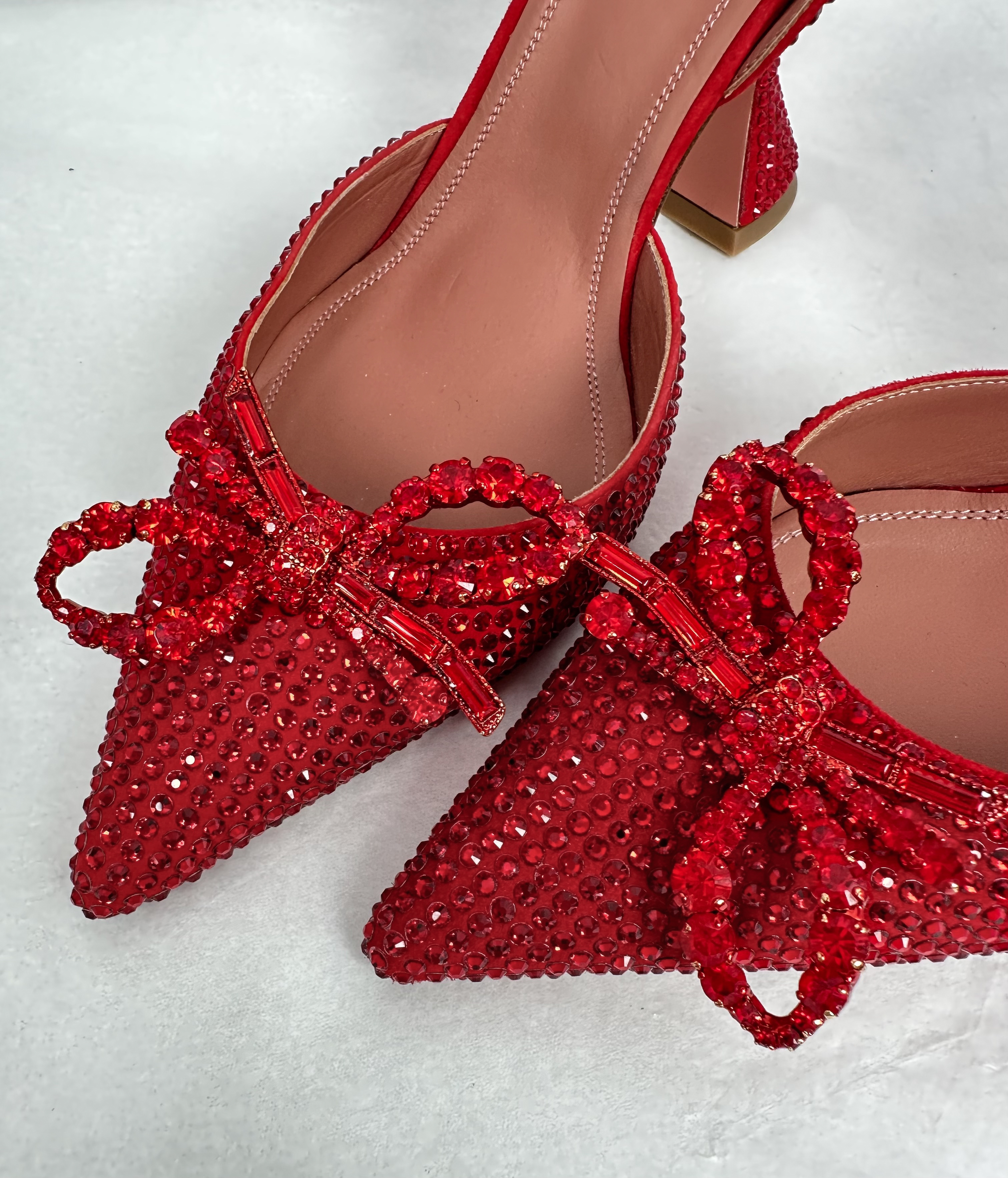 "Czerwone zamszowe obcasy wysadzane błyszczącymi kryształkami, ozdoba w kształcie kokardy na przodzie, kielichowy obcas, nosek w szpic, odkryta pięta, pasek nad piętą, skórzana wkładka. Stan bardzo dobry. Rozmiar 37."