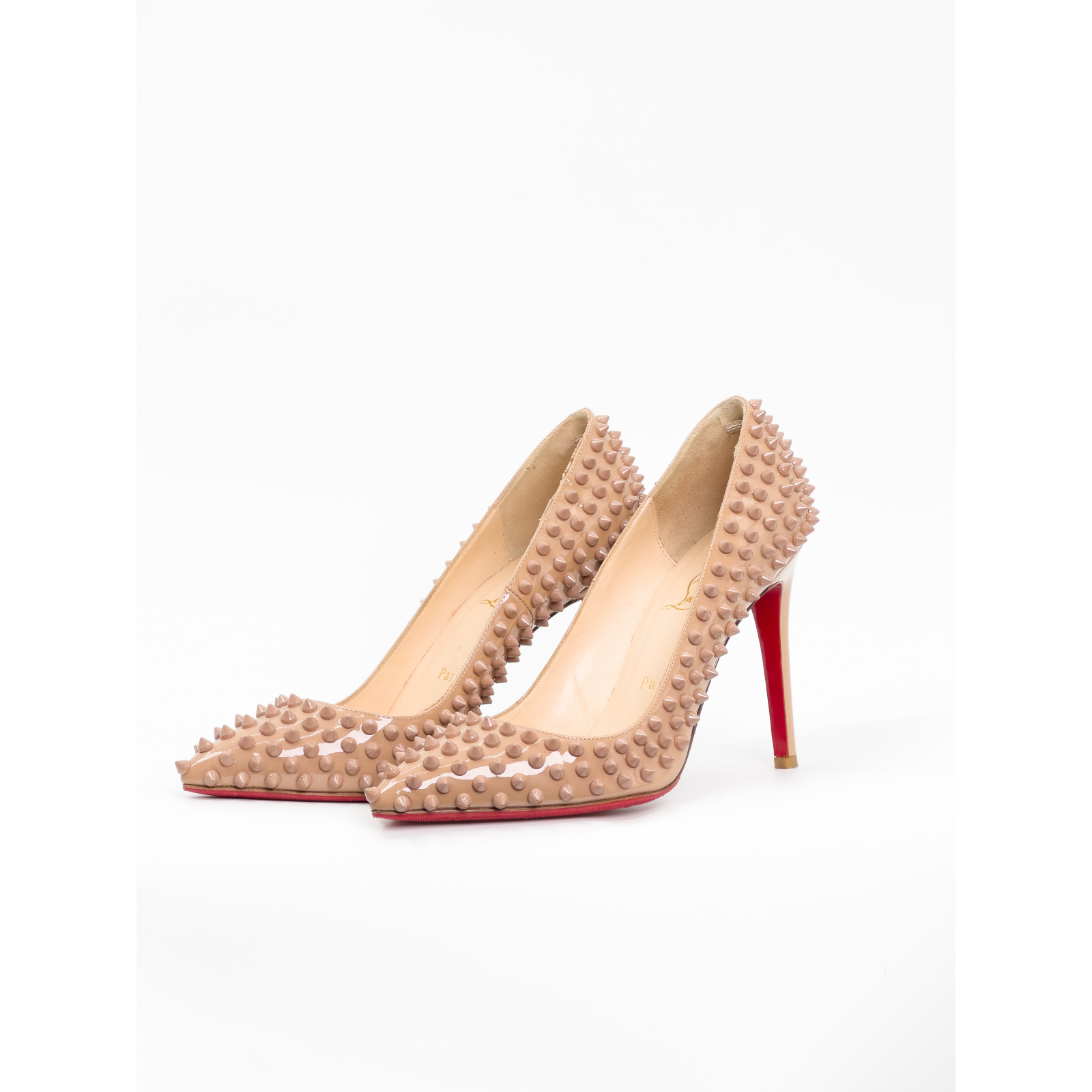 "Beżowe obcasy ozdobione ćwiekami w odcieniu taupe, nosek w szpic, cielista skórzana wkładka, czerwona podeszwa charakterystyczna dla marki, podzelowane, używane. Stan bardzo dobry, delikatne przetarcia na flekach oraz podeszwie. Rozmiar 39."