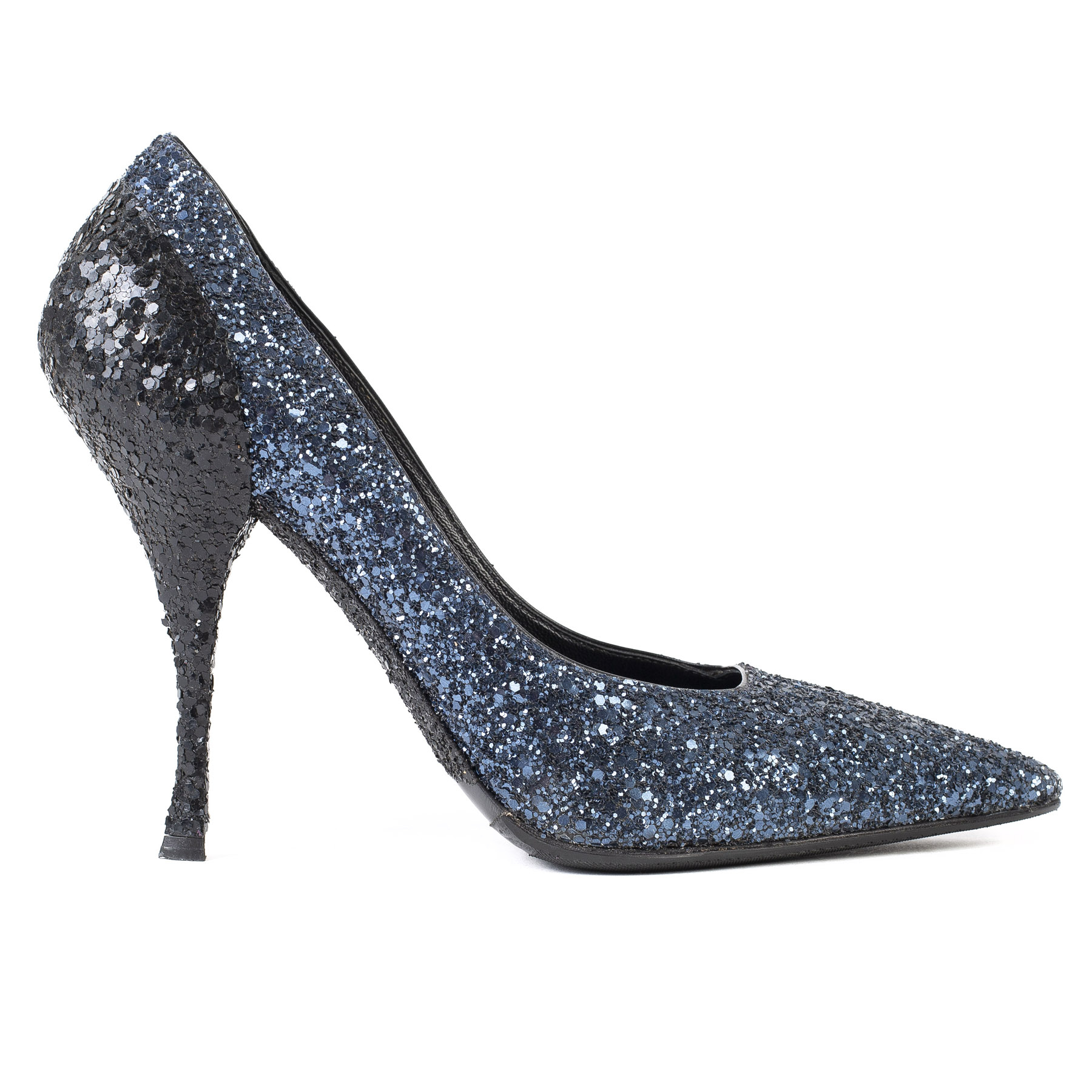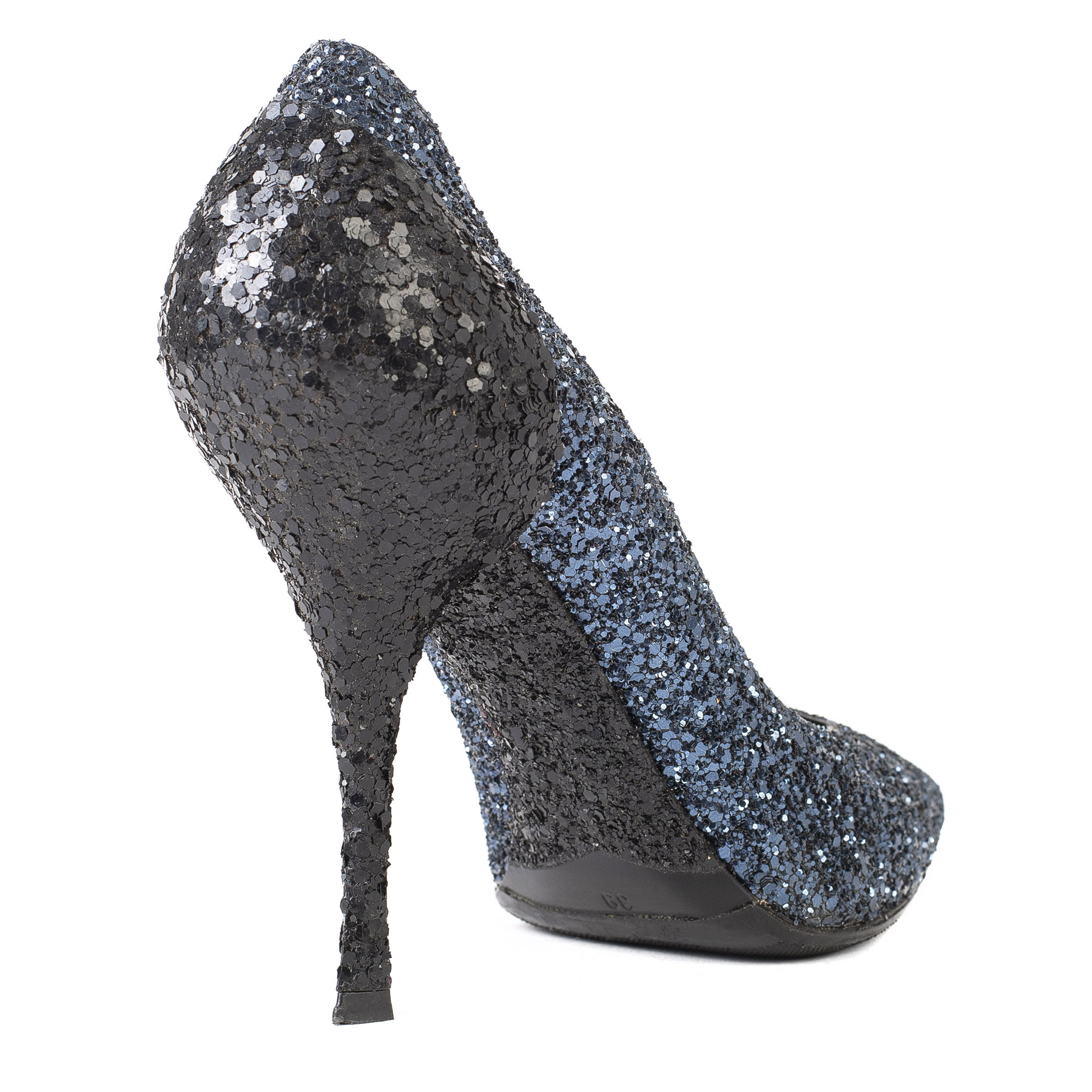 "Buty na obcasie w szpic , pokryte granatowo czarnymi cekinami , rozm 39"