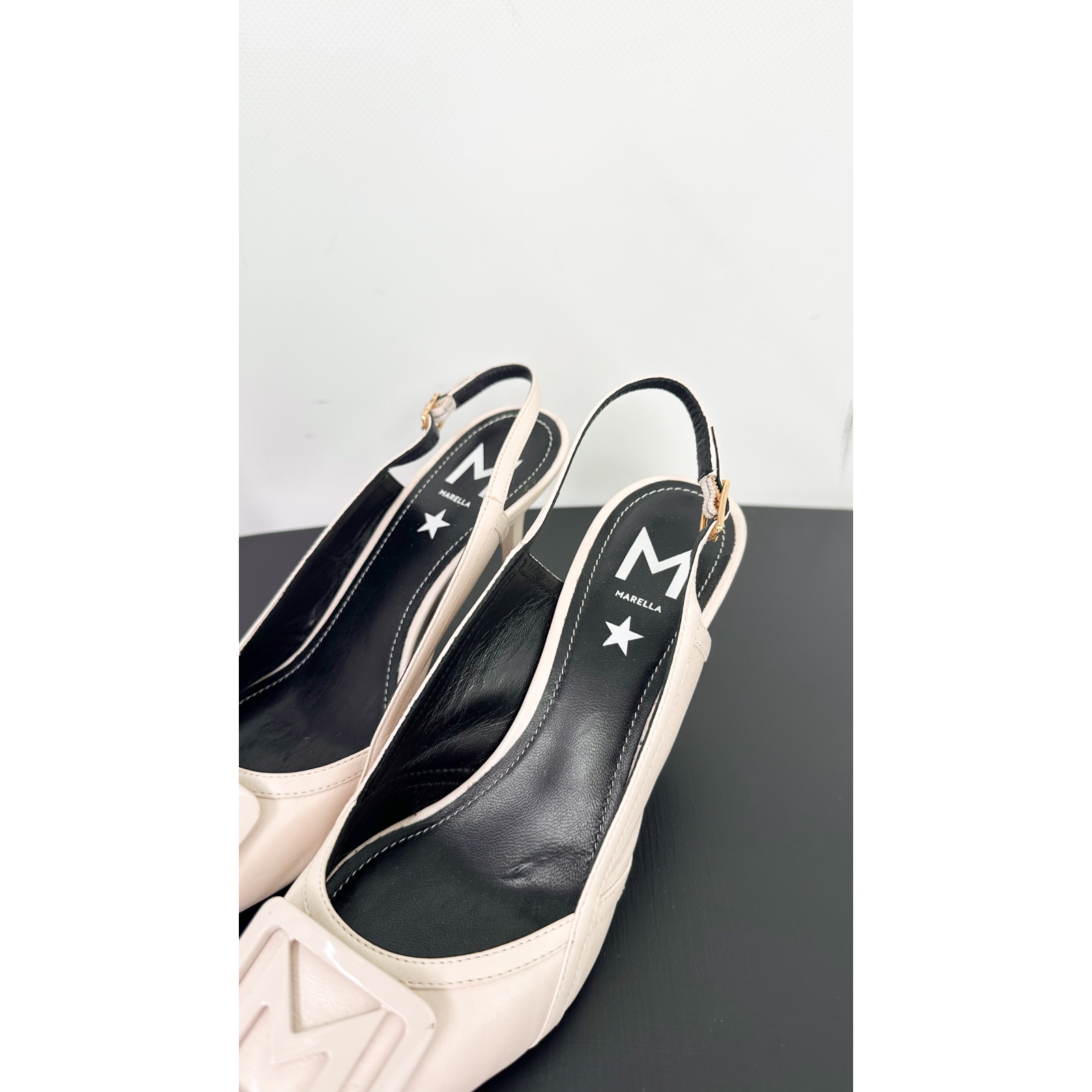 "Skórzane kremowe obcasy w szpic, zapinane z tyłu na pasek, z przodu logo marki na nosku. Rozmiar 37. Stan: bardzo dobry, delikatnie przybrudzona podeszwa oraz przetarte noski."