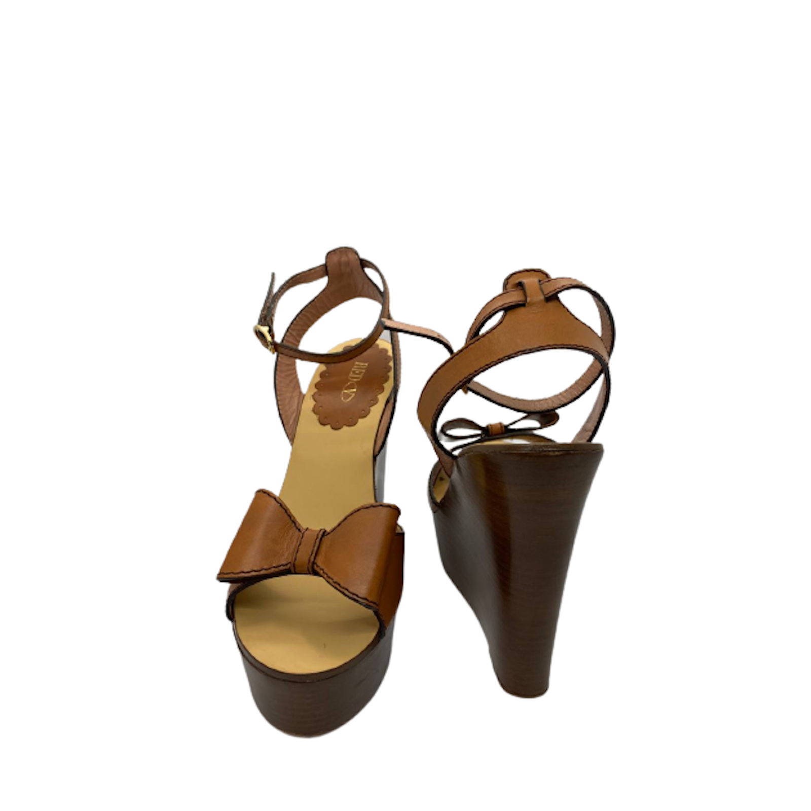 "beżowe skórzane sandałki zkokardą na przodzie, na koturnie 13cm i platformie 3,5 cm, zapinane na kostce, używane, stan bardzo dobry"