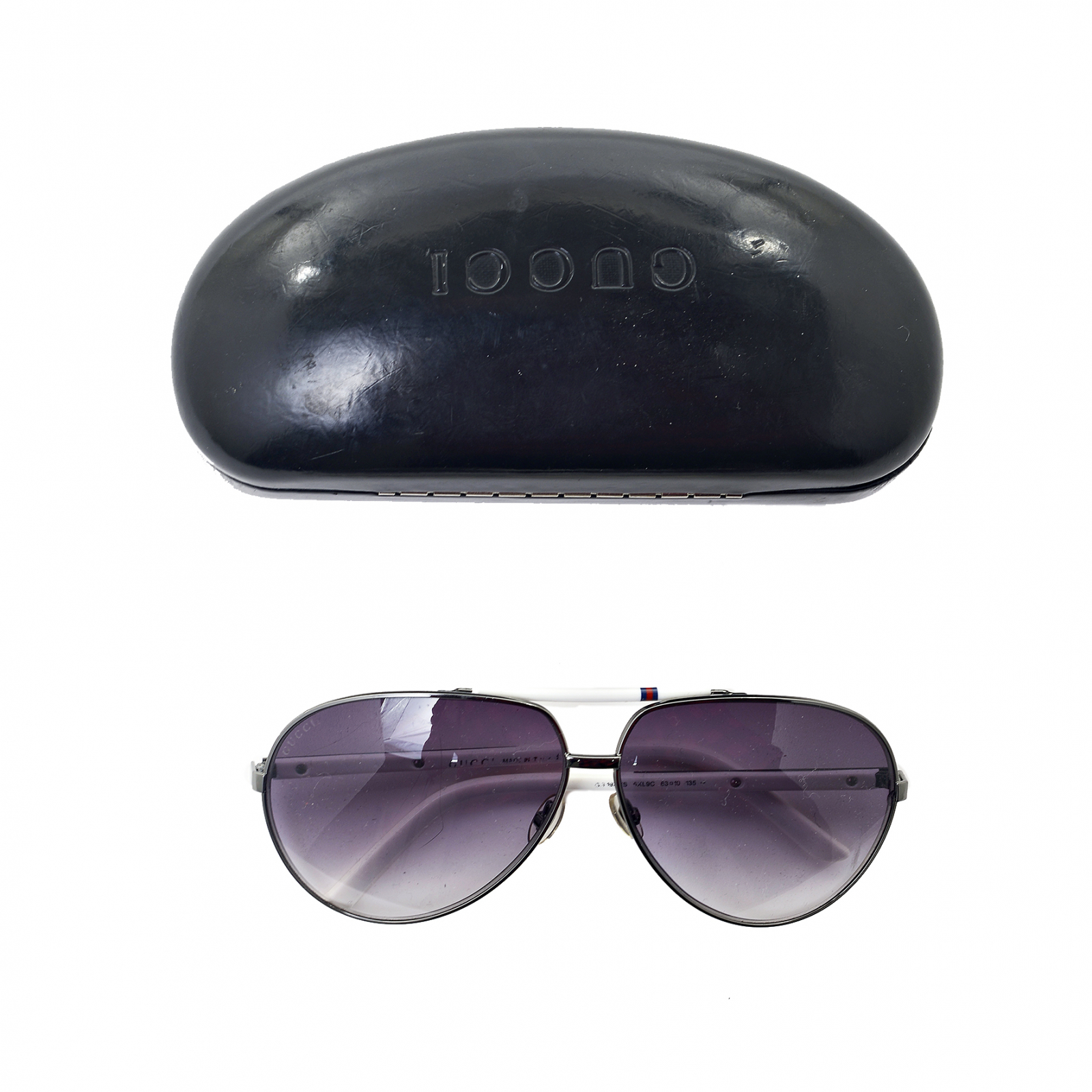 "Okulary Gucci biało, niebiesko-czerwone boki, z oryginalnym etui w zestawie, w bardzo dobrym stanie."