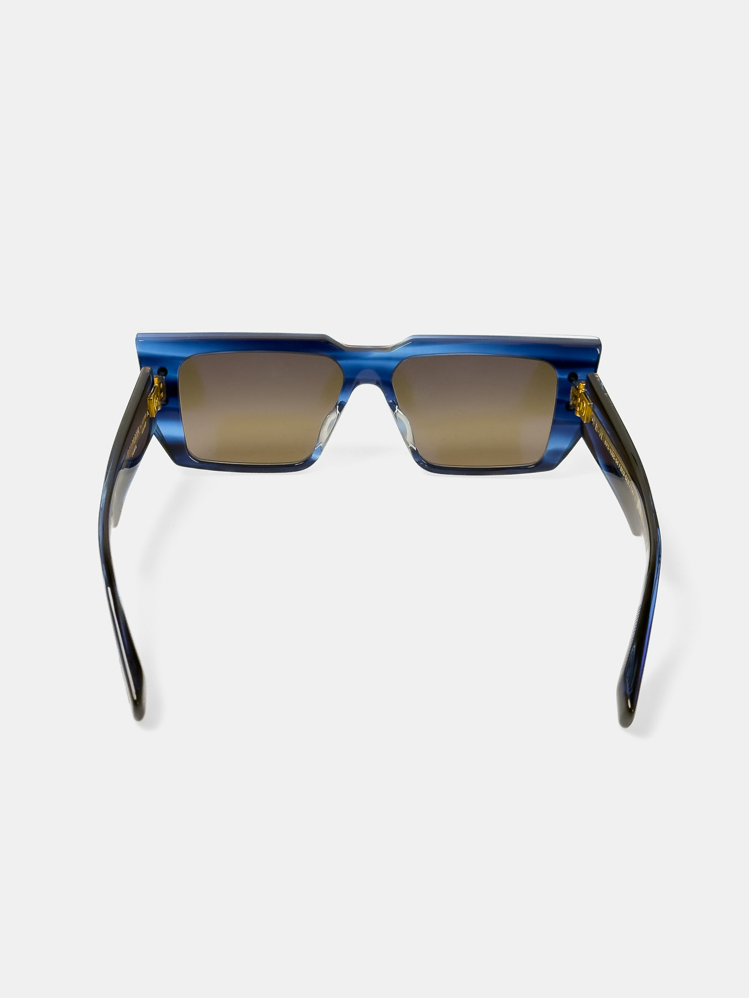 "Granatowe okulary przeciwsłoneczne, plastikowe cieniowane oprawki, prostokątne szkła z poświatą brązu, złote logo marki marki na oprawkach, w zestawie z pudełkiem, etui oraz ściereczką. Stan bardzo dobry, delikatne rysy na oprawkach."