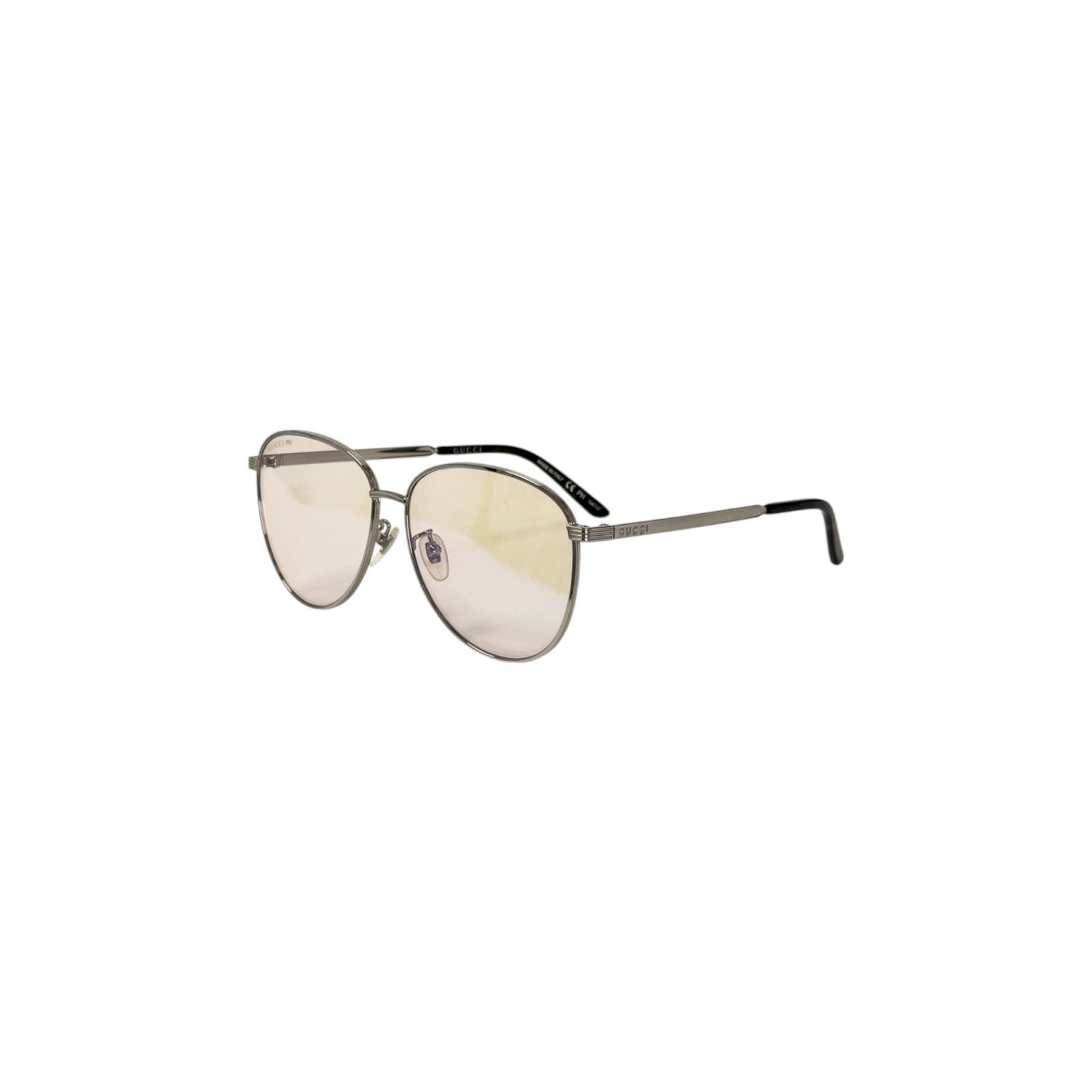 "Srebrne okulary przeciwsłoneczne, aviator, jasnożółte szkła, gumowe, transparentne logowane noski, zauszniki z logo marki wykończone szylkretowymi wstawkami, w zestawie z etui oraz ściereczką. Stan bardzo dobry, delikatna rysa na prawym szkle."