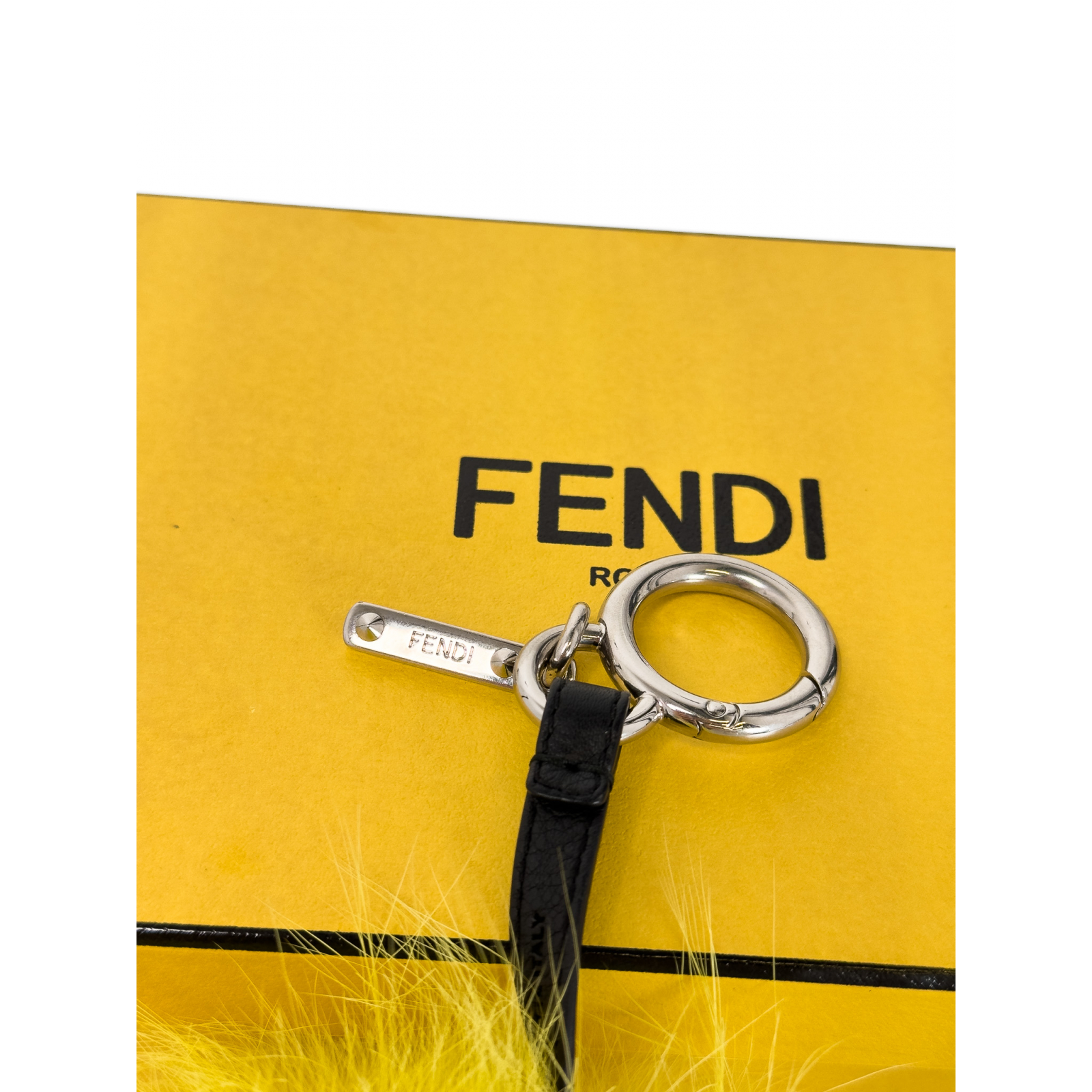 "Duży okrągły futrzany brelok do torebki, w odcieniach żółtego, czerni oraz brzoskwini, wykończony czarnym skórzanym chwostem, srebrny karabińczyk, zawieszka w kształcie gwiazdy, w zestawie z pudełkiem oraz workiem przeciwkurzowym. Stan idealny."