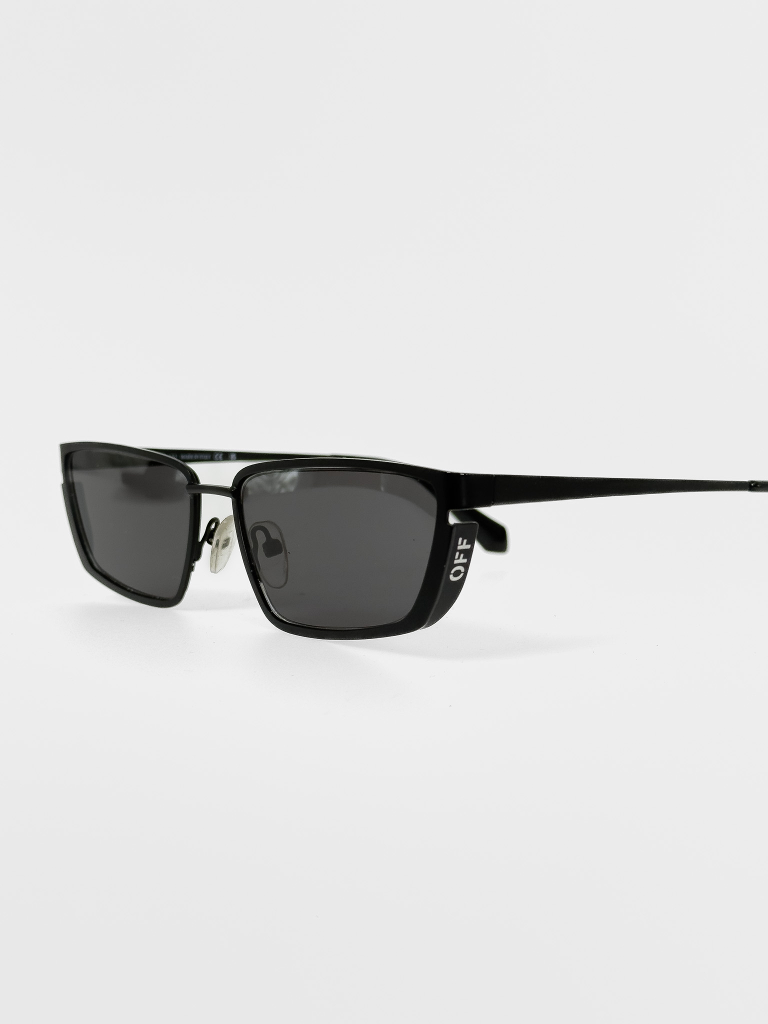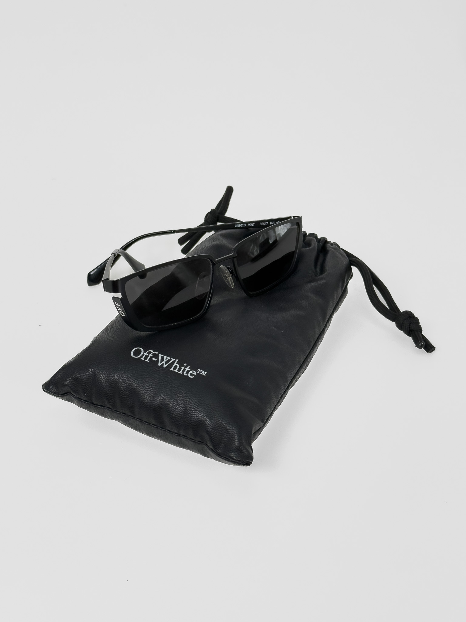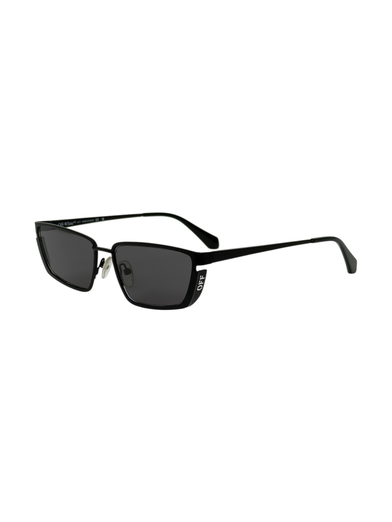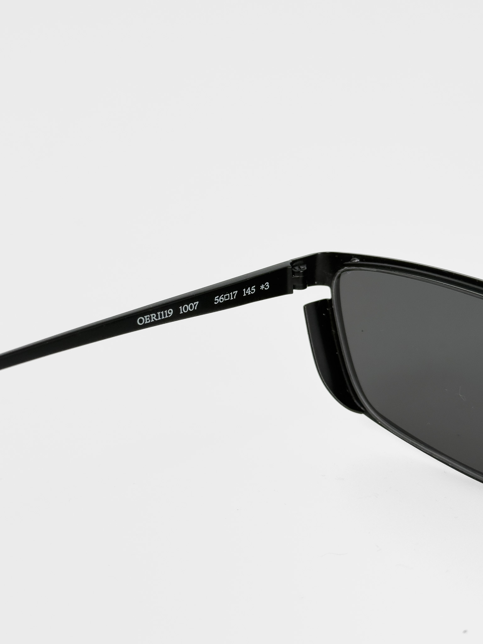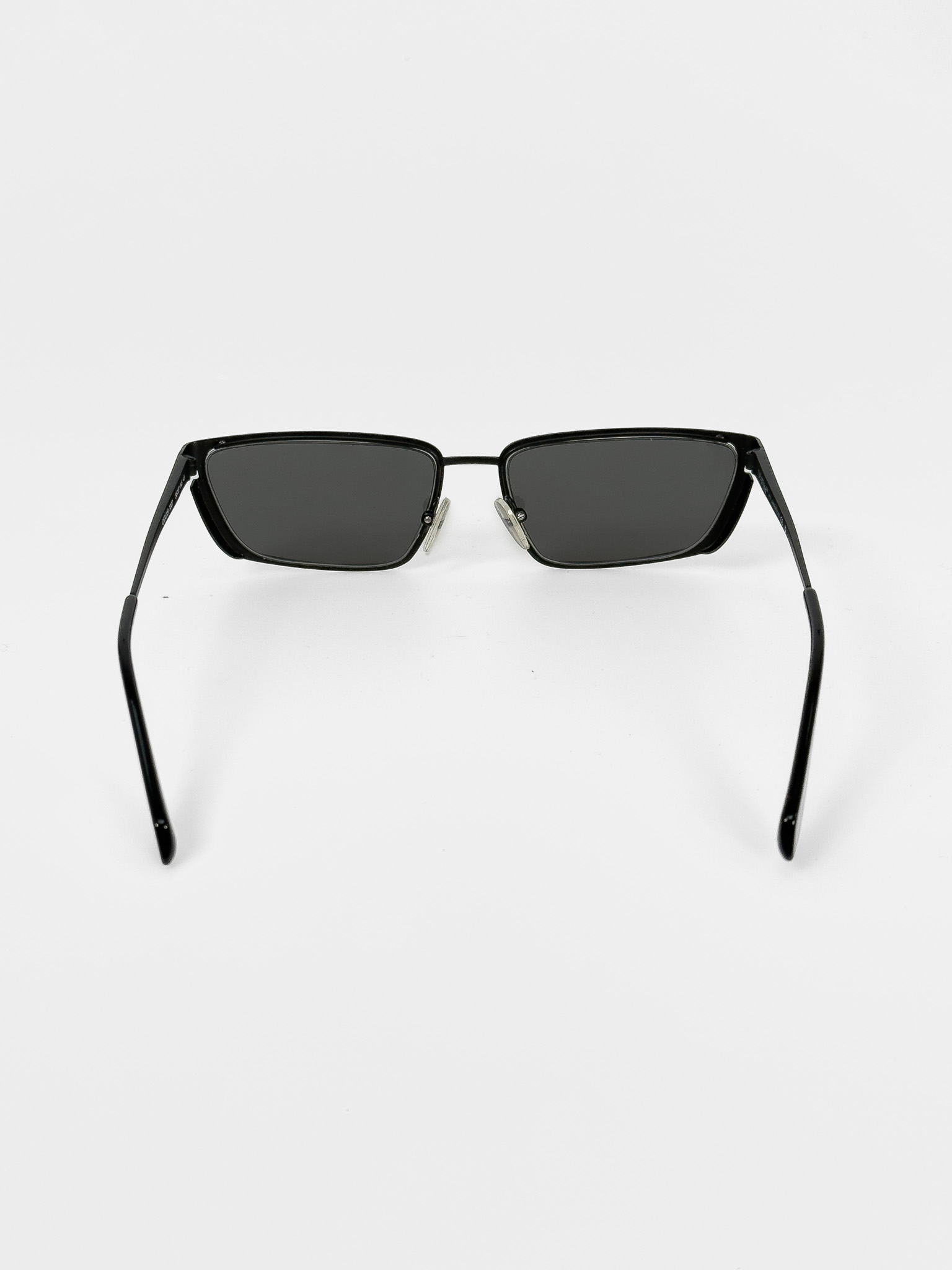 "Czarne okulary przeciwsłoneczne, cienkie prostokątne szkła, matowe oprawki ozdobione białym logo marki, transparentne noski, zauszniki wykończone połyskującymi plastikowymi wstawkami, w zestawie ze skórzanym etui oraz ściereczką marki "CELINE". Stan bardzo dobry, minimalne rysy na zausznikach."