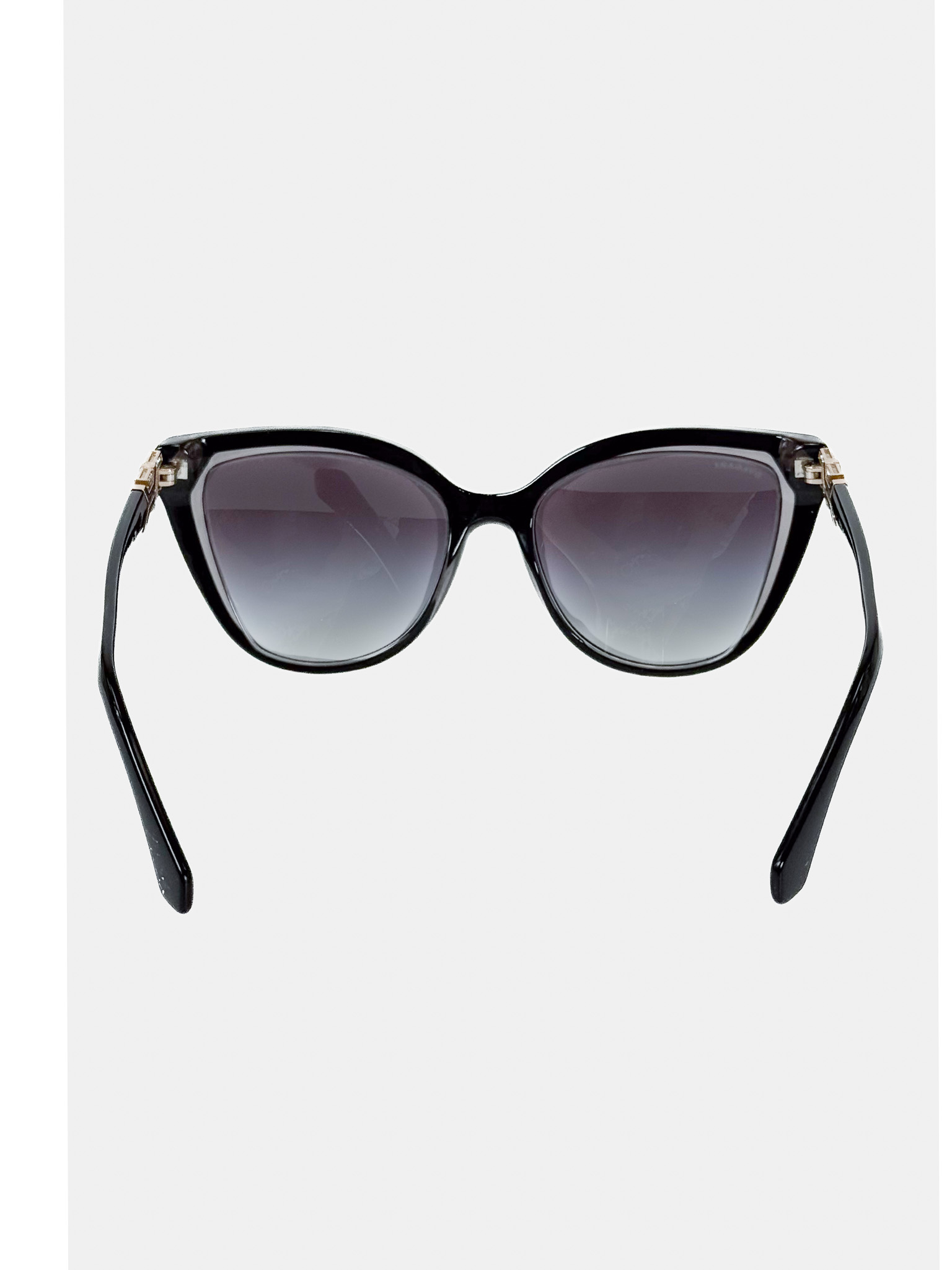 "Czarne plastikowe okulary przeciwsłoneczne, kocie oko, cieniowane szkła w odcieniach fioletu oraz niebieskiego, logowane zauszniki ozdobione cyrkoniami, w zestawie z etui, ściereczką oraz woreczkim. Stan bardzo dobry, delikatne rysy na oprawkach."