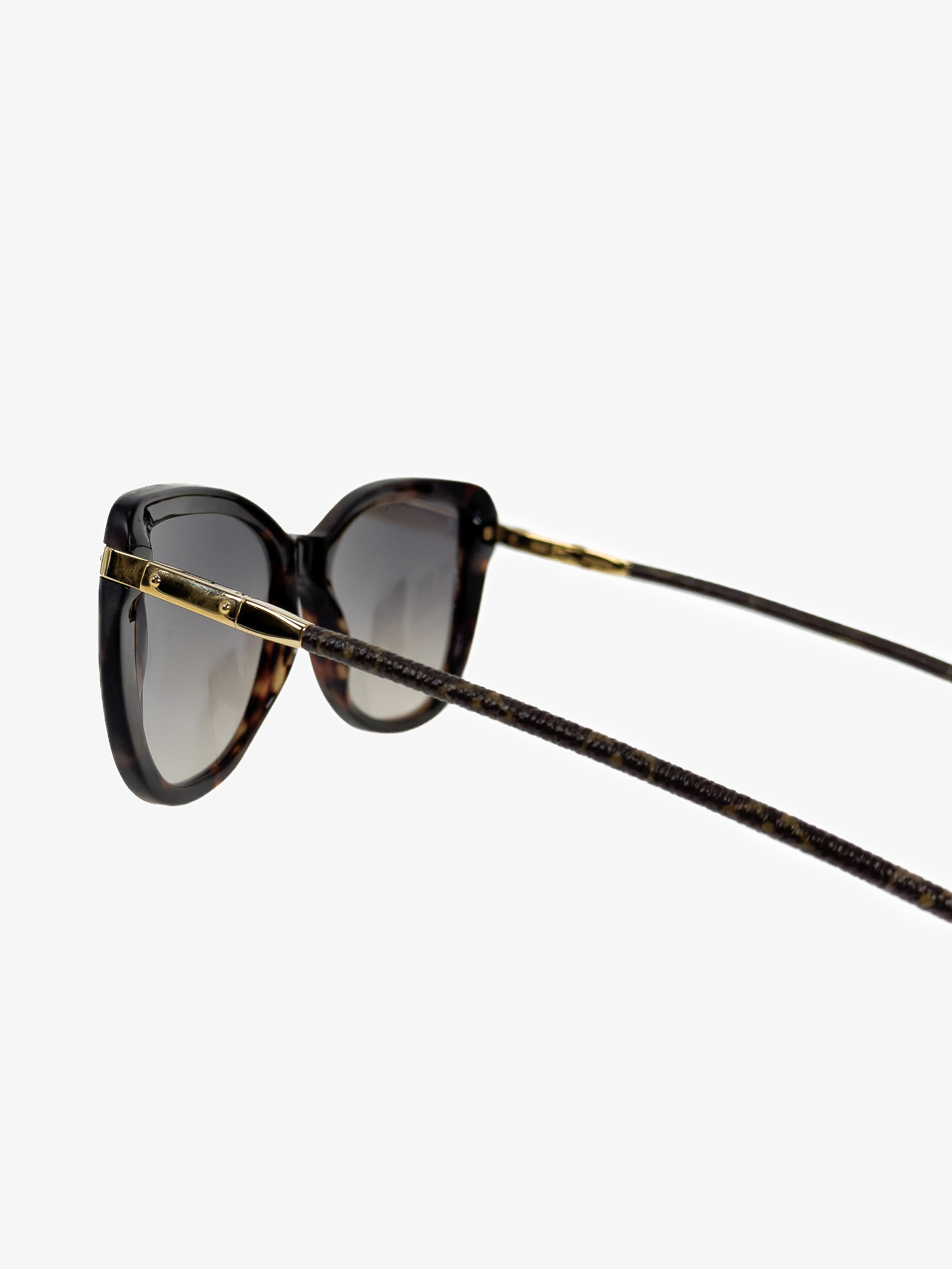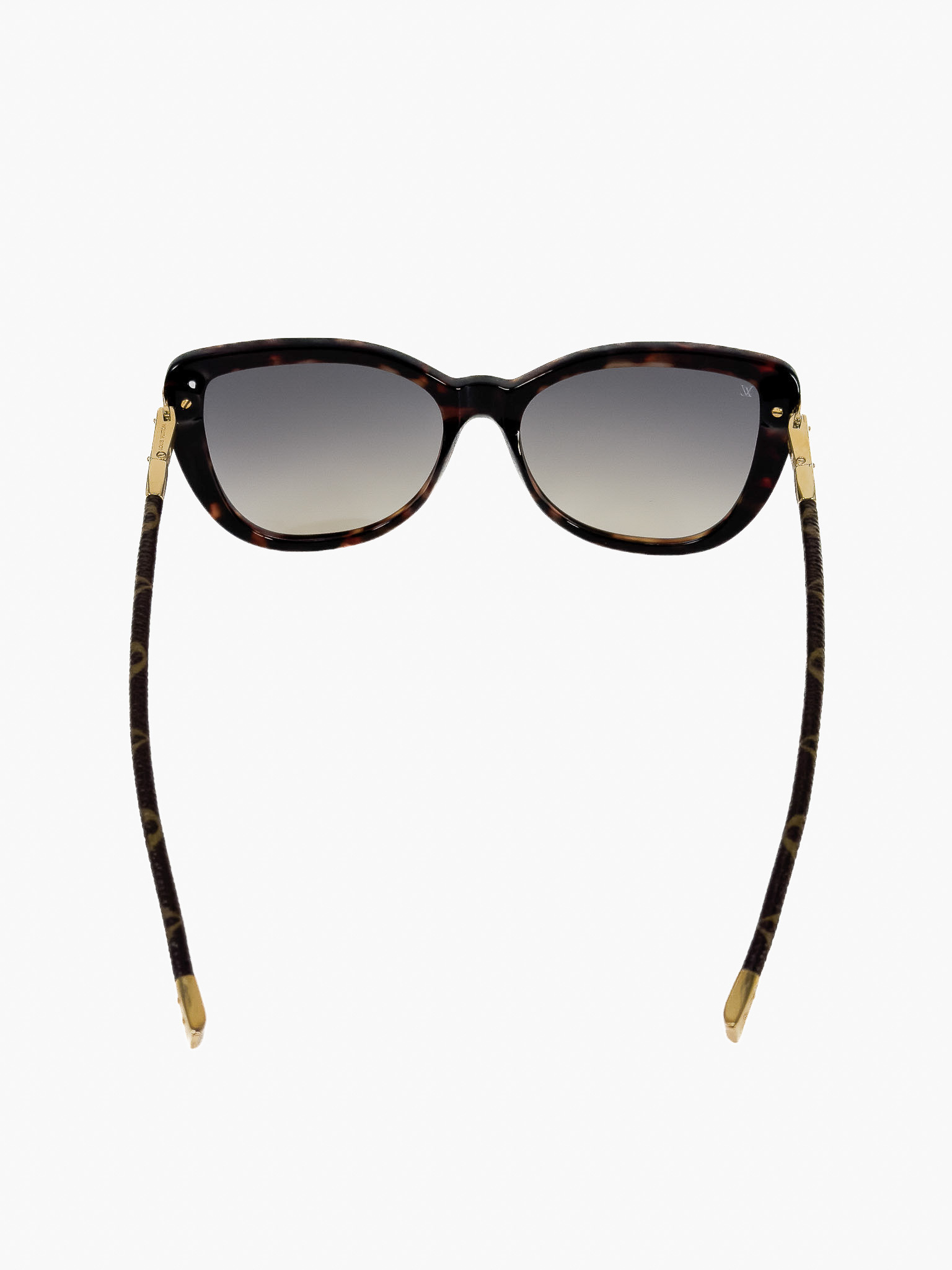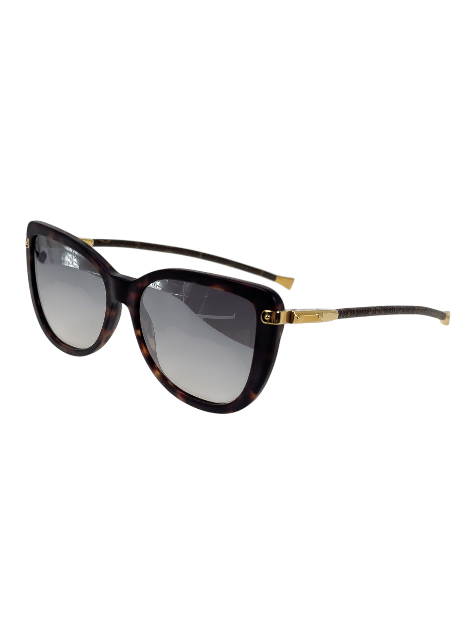 "Okulary przeciwsłoneczne o owalnym kształcie w szylkretowych oprawkach, cieniowane szkła, zauszniki skórzane w logo marki, mają opcję przekręcania. Etui w zestawie. Stan idealny."