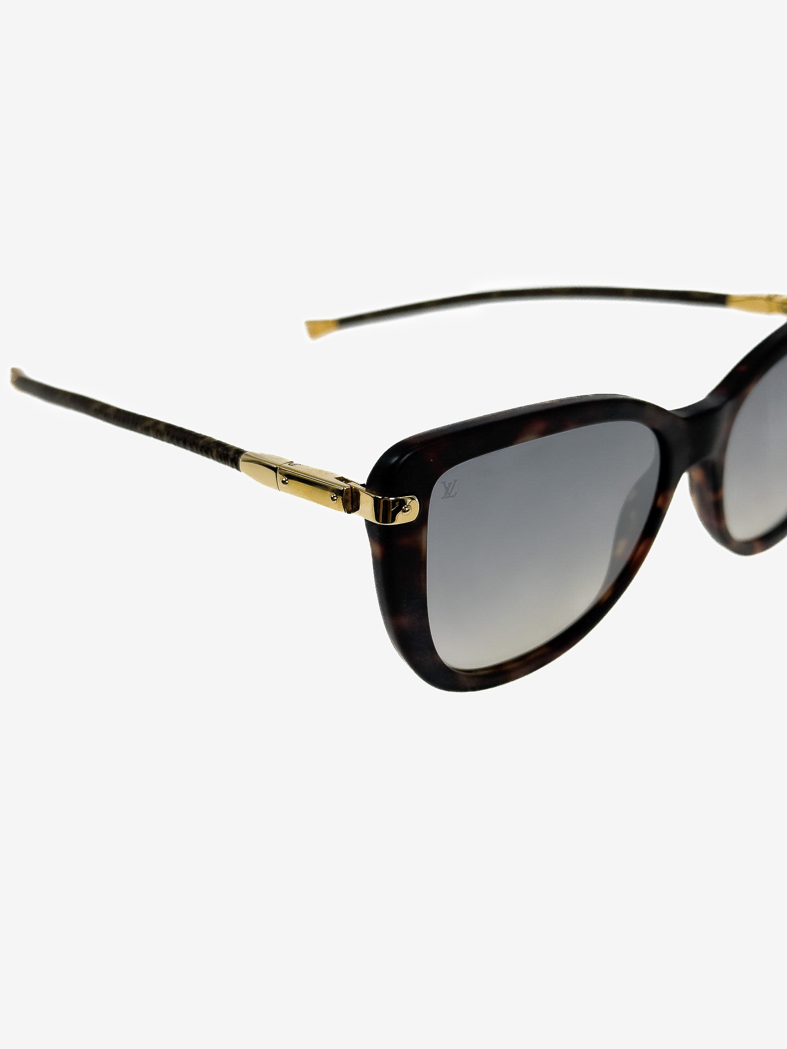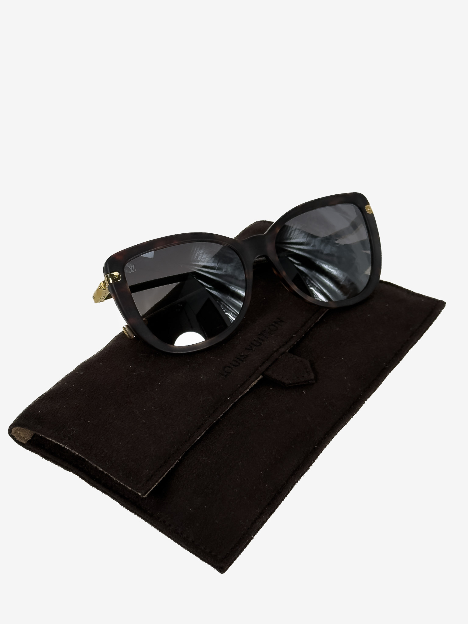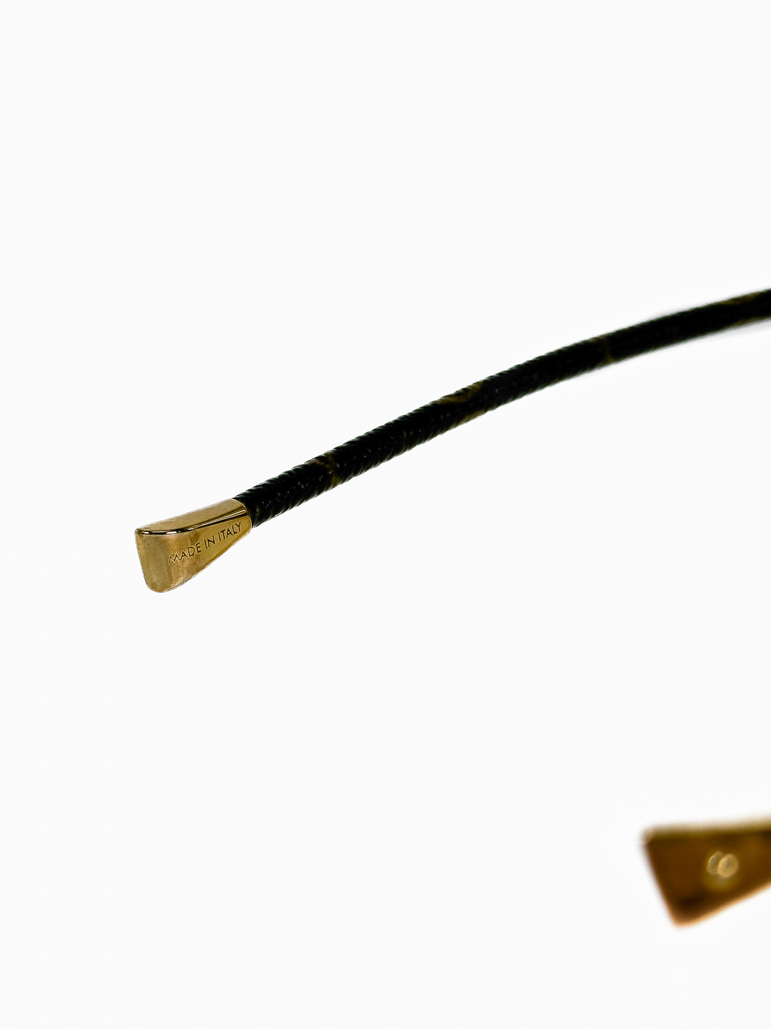 "Okulary przeciwsłoneczne o owalnym kształcie w szylkretowych oprawkach, cieniowane szkła, zauszniki skórzane w logo marki, mają opcję przekręcania. Etui w zestawie. Stan idealny."
