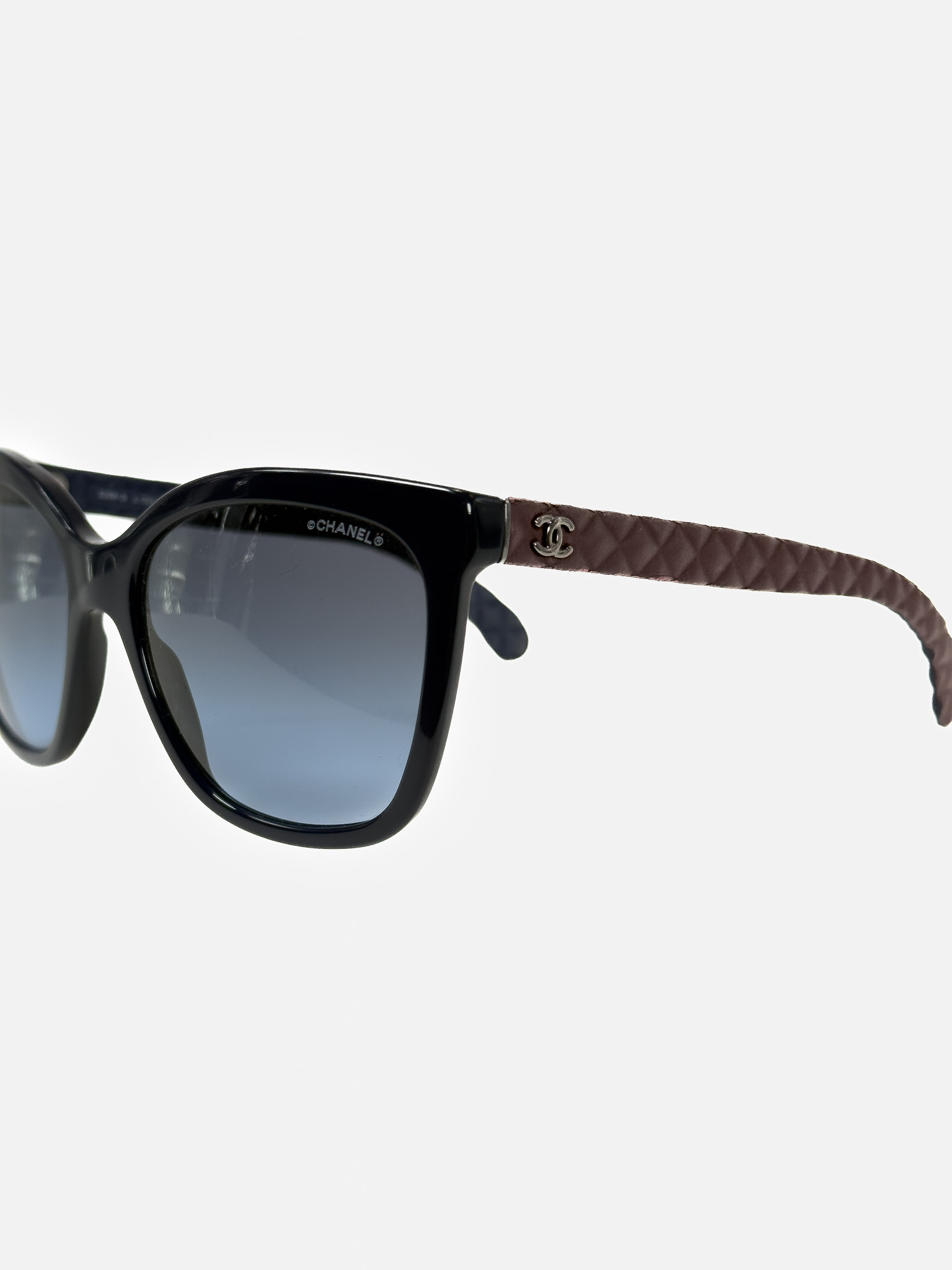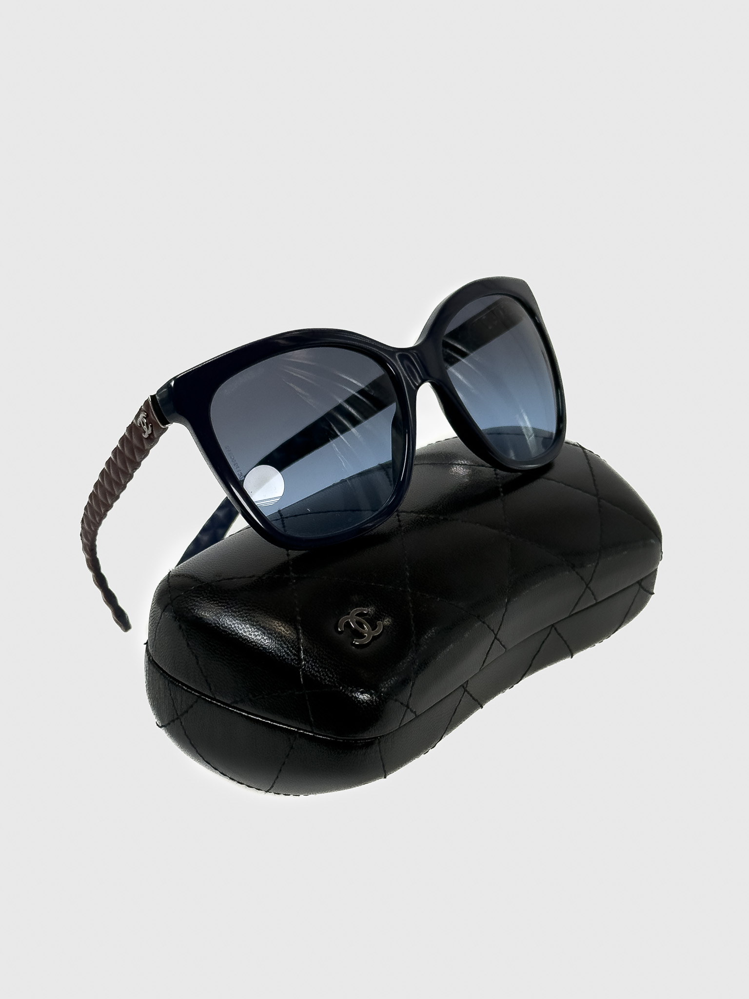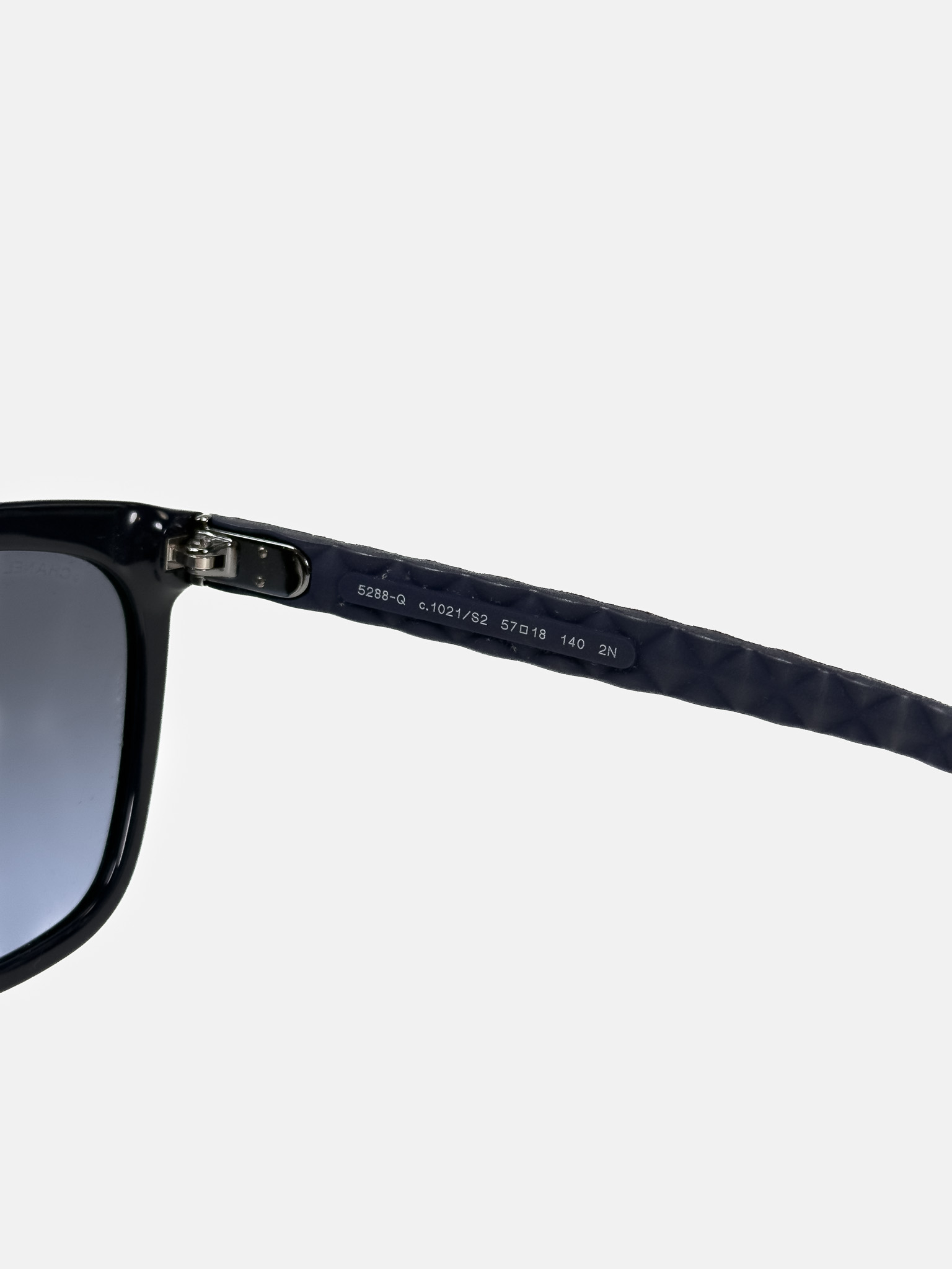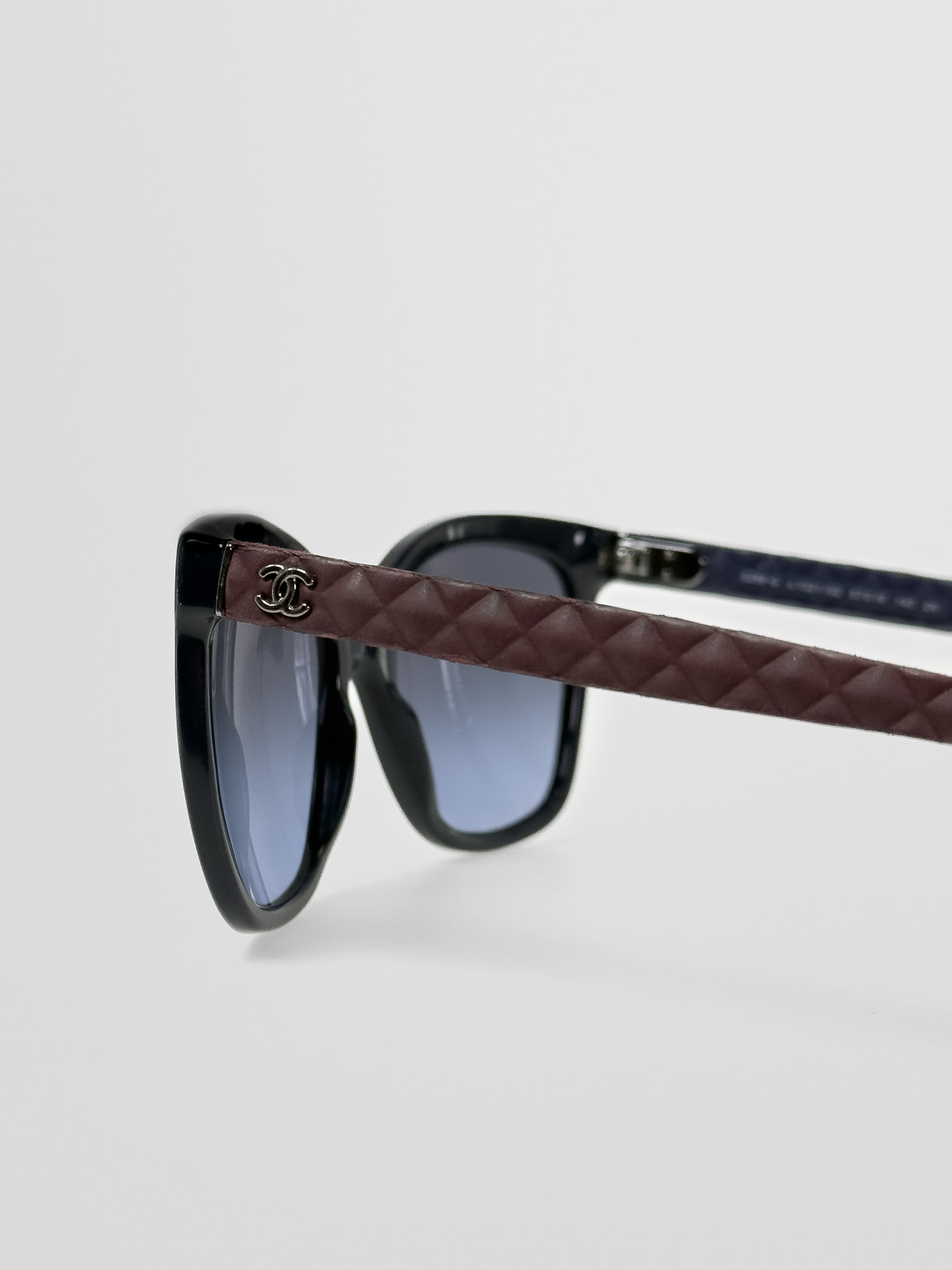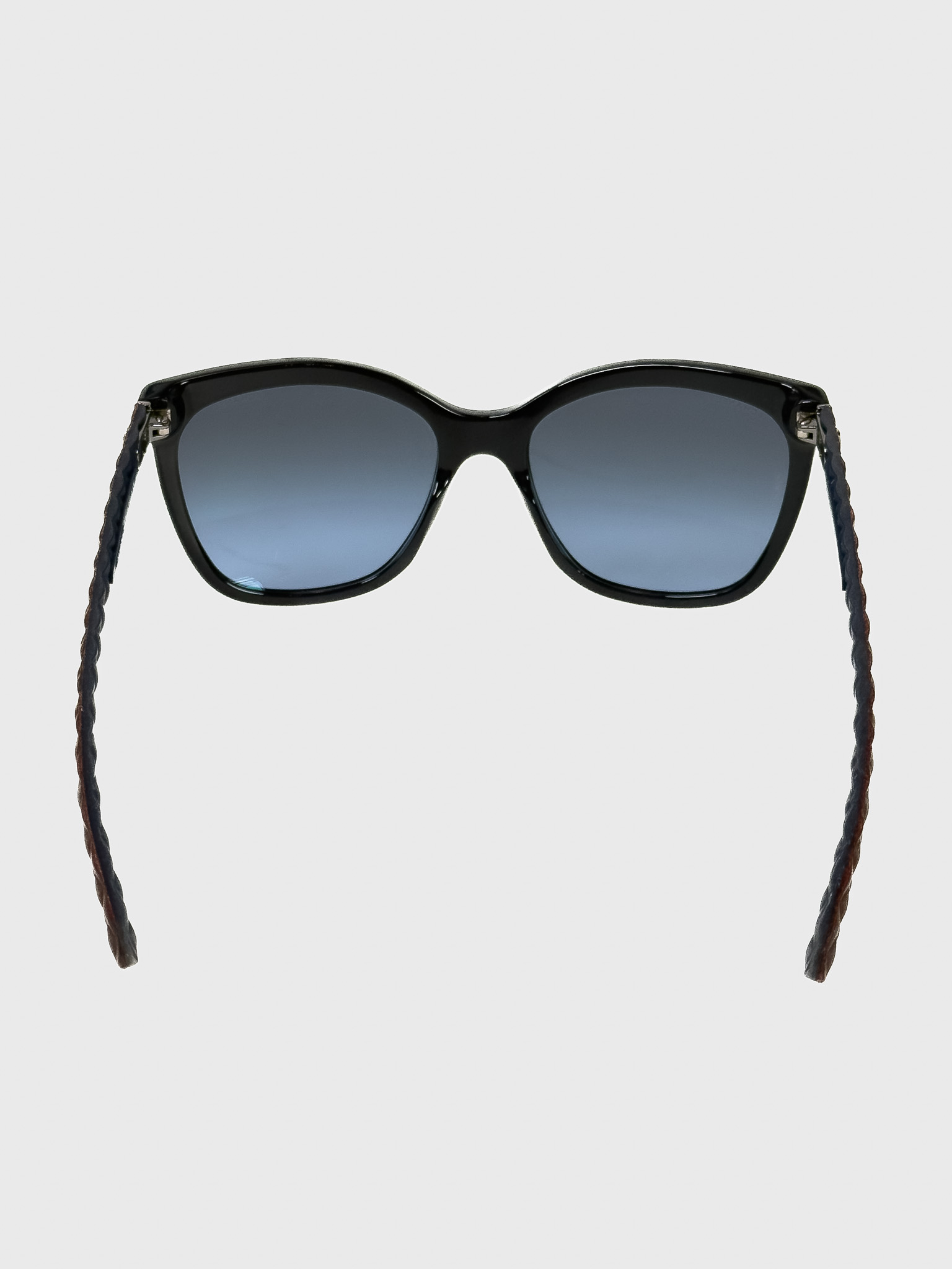 "Granatowe okulary przeciwsłoneczne, lekko kwadratowe szkła, ciemne granatowe, cieniowane szkła, brązowe - pikowane oprawki, srebrne delikatne logowanie na oprawkach. Etui w komplecie. Stan bardzo dobry."