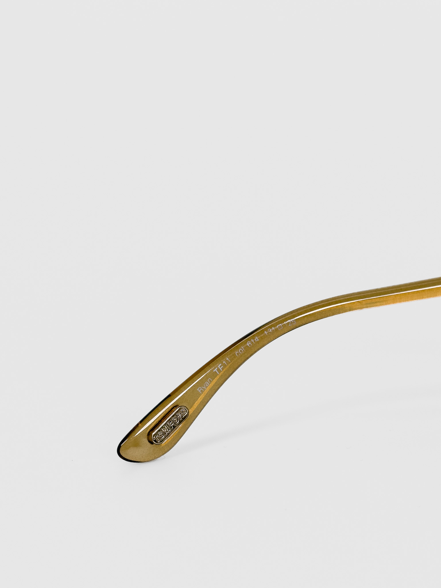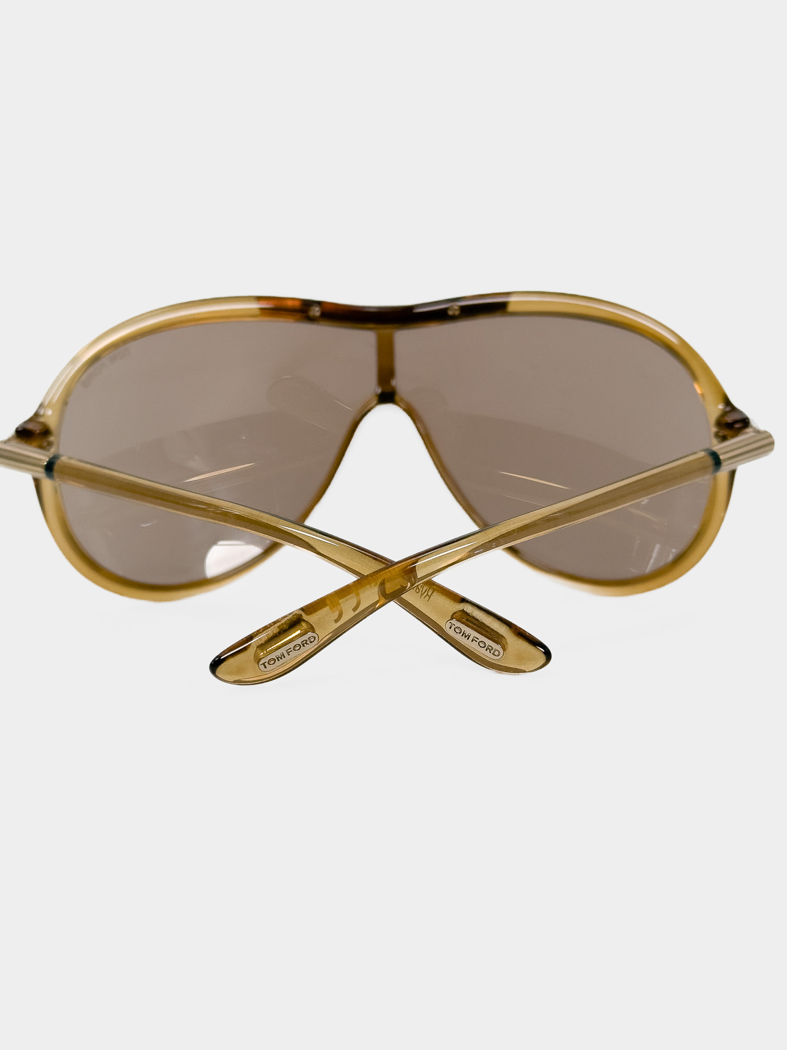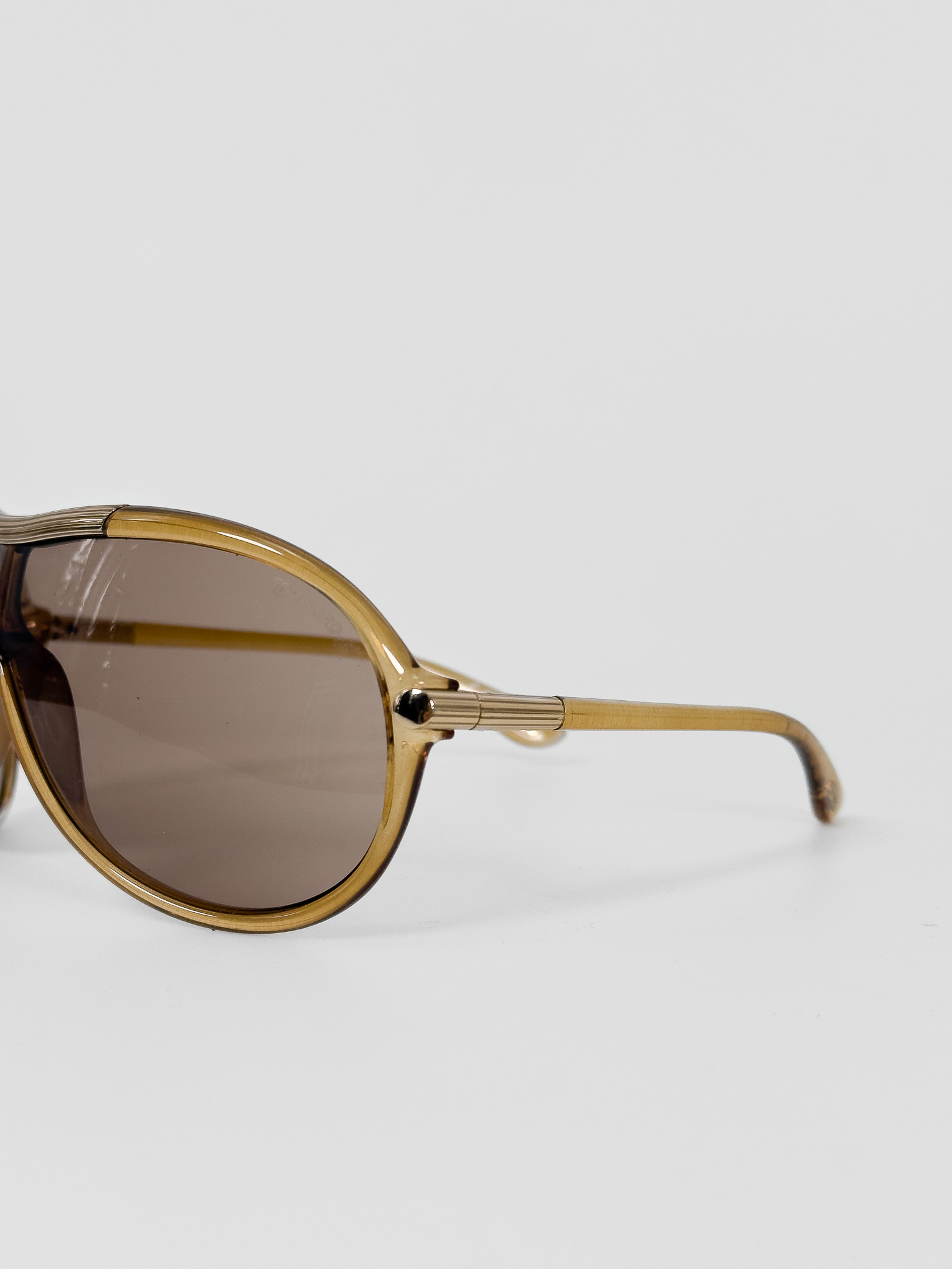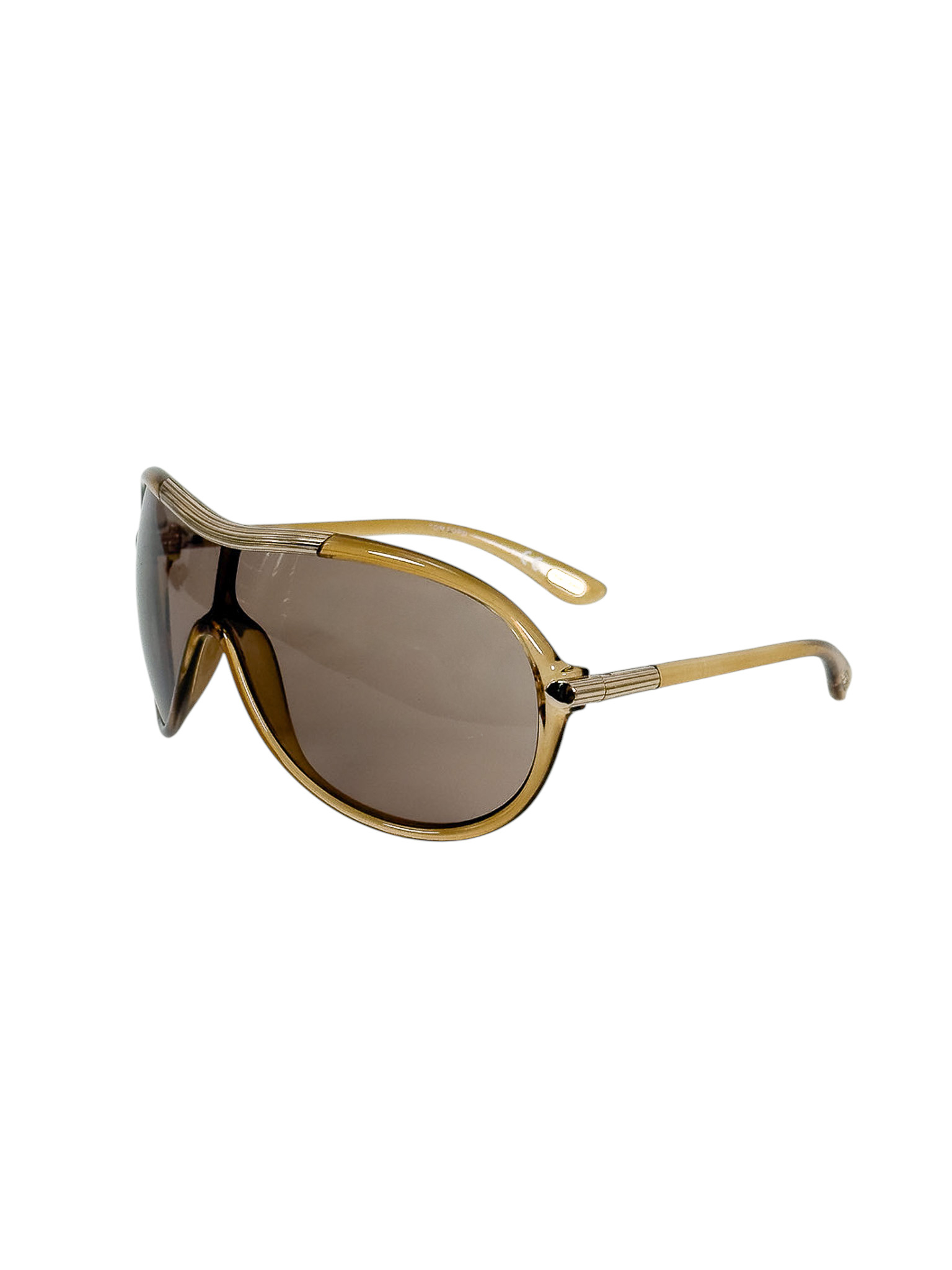 "Ciemnożółte plastikowe okulary przeciwsłoneczne, duże brązowe szkła, złote wstawki, zauszniki wykończone logo marki, w zestawie z etui oraz ściereczką. Stan bardzo dobry, delikatnie przekrzywione."