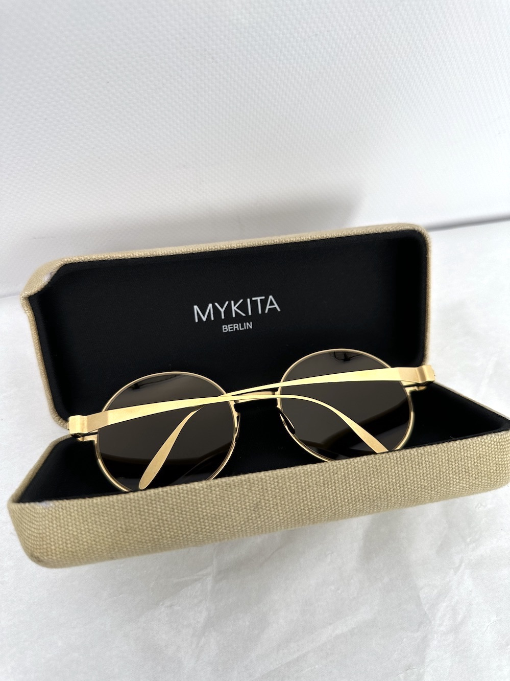 "Złote okulary przeciwsłoneczne, okrągłe szkła, plastyczne oprawki, używane. Stan bardzo dobry, małe rysy na oprawkach. Etui w komplecie."