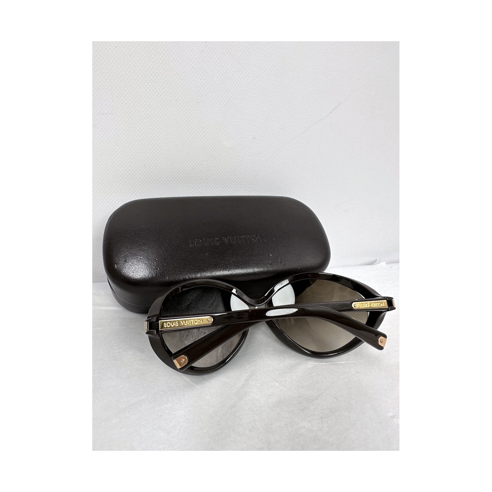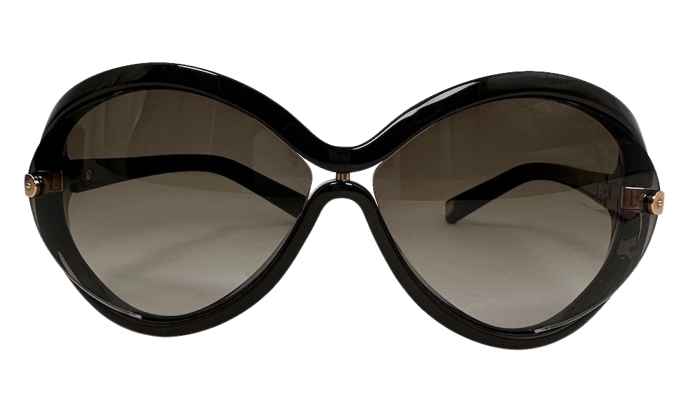 "Brązowe okulary przeciwsłoneczne, przyciemniane szkła ułożone w kształt znaku nieskończoności, metalowe elementy w kolorze złotym przy zausznikach. Stan: dobry - lekkie rysy na szkłach, przetarcia na zausznikach i metalowych elementach. Skład: materiał syntetyczny. W zestawie z etui (przetarty i zarysowany materiał) i woreczkiem przeciwkurzowym. Wymiary szkieł: 5,5 x 65 cm."