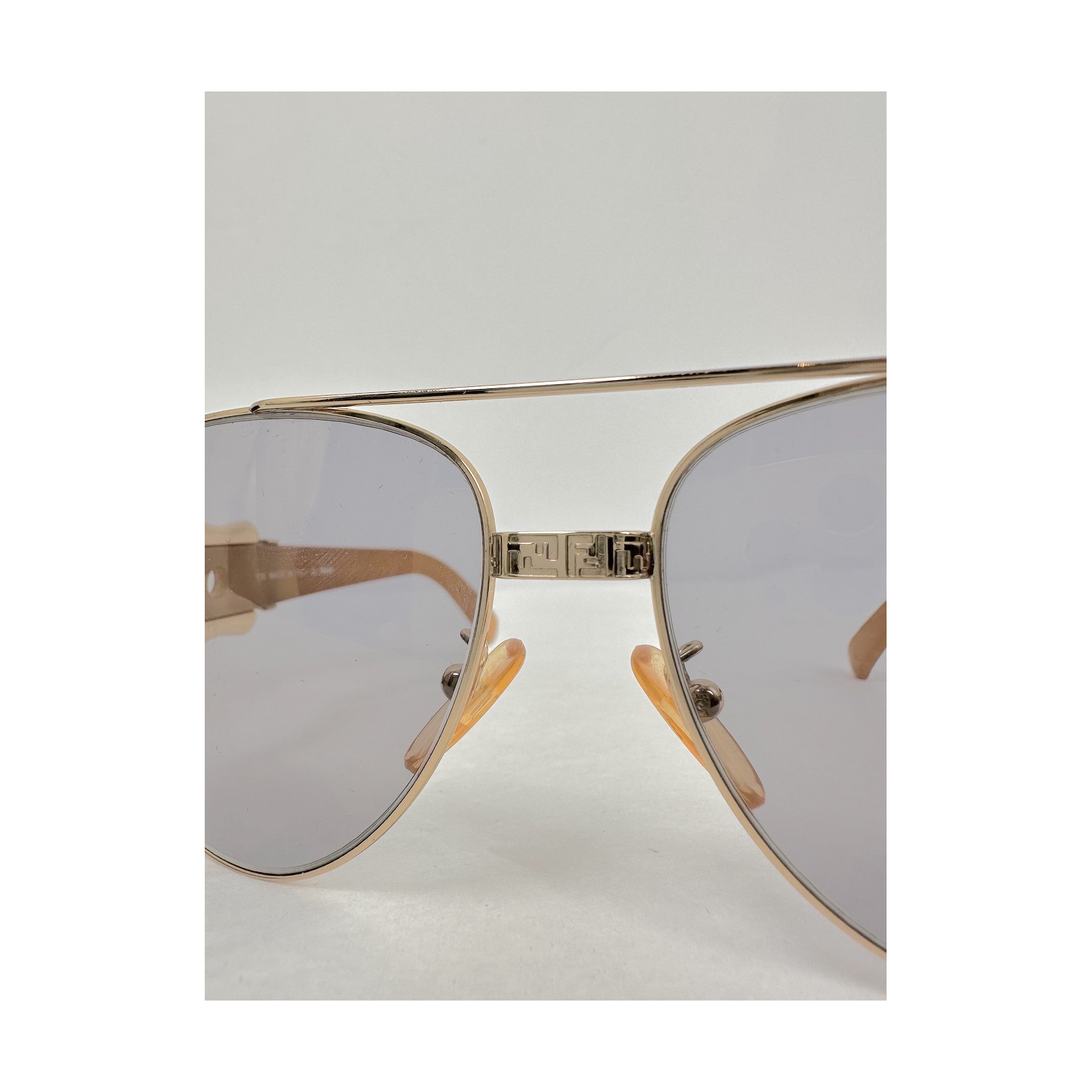 "Srebrne okulary przeciwsłoneczne wykończone jasnobrązowymi plastikowymi zausznikami przypominającymi pasek ze sprzączką, pilotki, logowane oprawki oraz noski, w zestawie z etui, używane. Stan bardzo dobry, lekko porysowane oprawki."