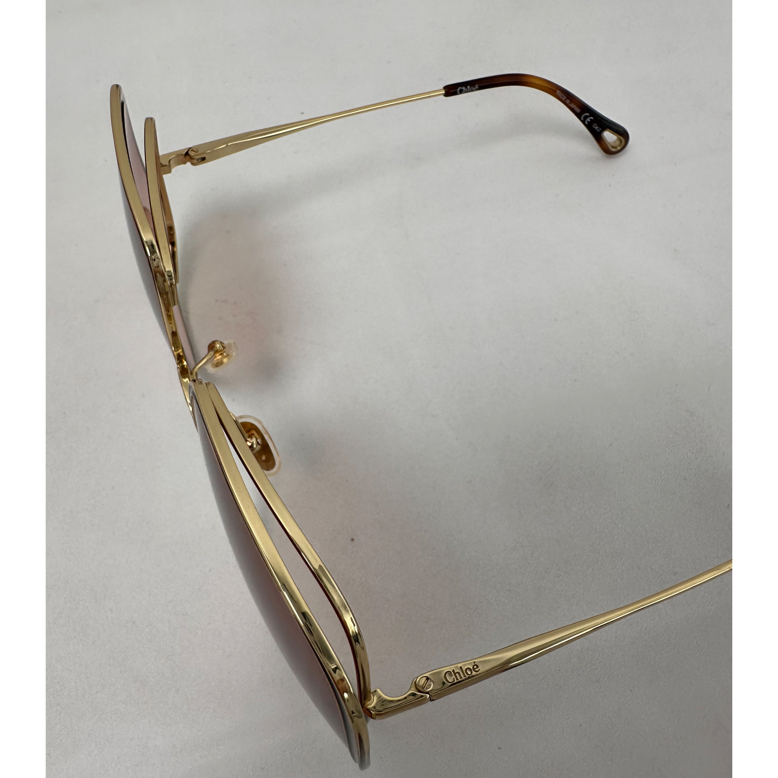 "Brązowe okulary przeciwsłoneczne, kwadratowe cieniowane brązowe szkła, szylkretowe wstawki przy szkłach oraz na zausznikach, złote logowane noski, oprawki oraz detale na zausznikach. Stan bardzo dobry. Brak etui."