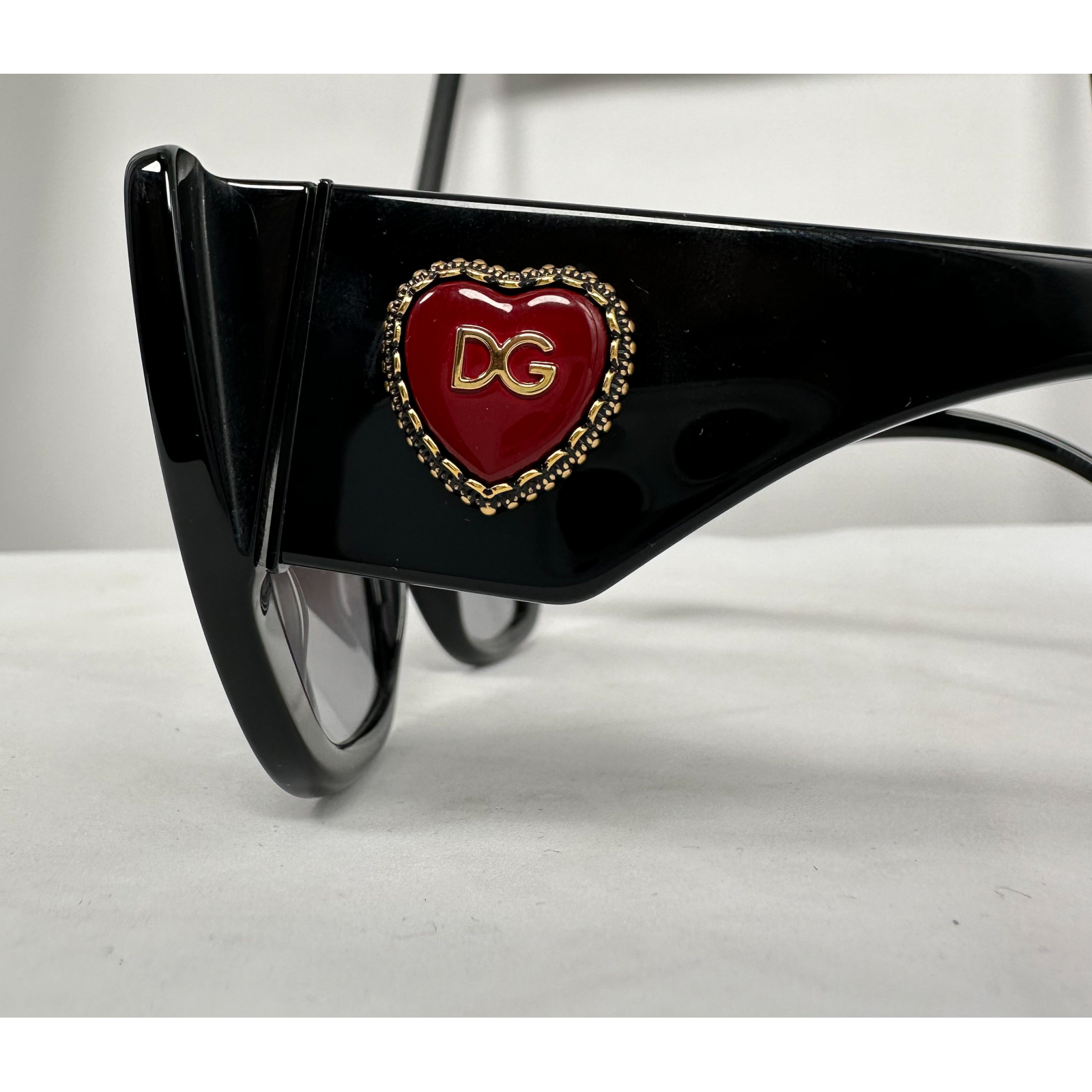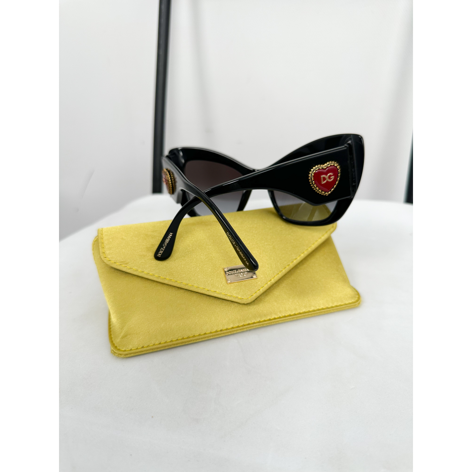 "Czarne plastikowe okulary przeciwsłoneczne, kocie oko, zauszniki ozdobione czerwoną grafiką w kształcie serca ze złotym logo marki, w zestawie z etui oraz ściereczką. Stan bardzo bobry, delikatnie porysowane."