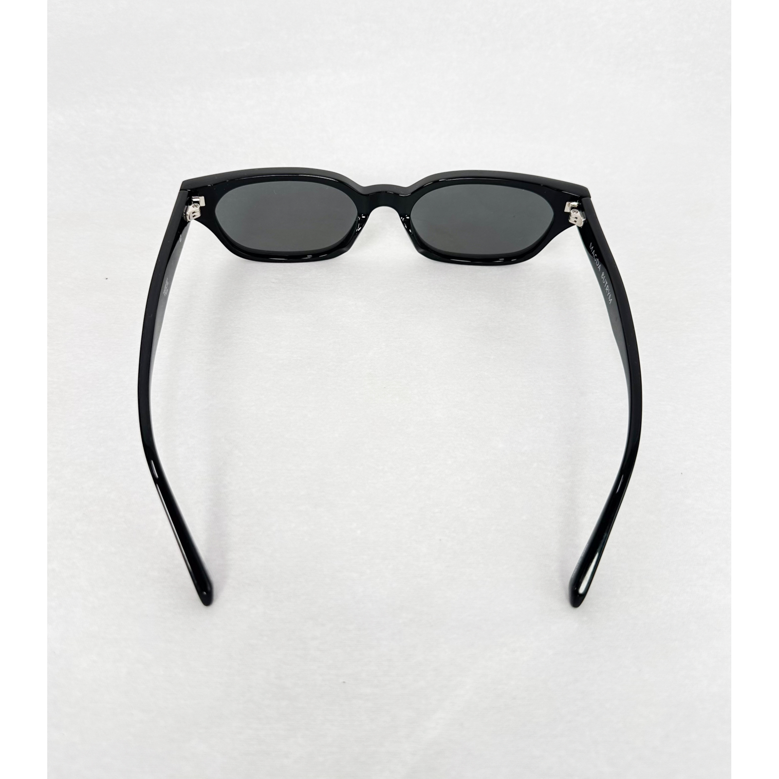 "Czarne okulary przeciwsłoneczne, wąskie owalne szkła, plastikowe oprawki wykończone srebrnym logo marki na zausznikach, używane. Stan bardzo dobry, delikatnie porysowane oprawki."
