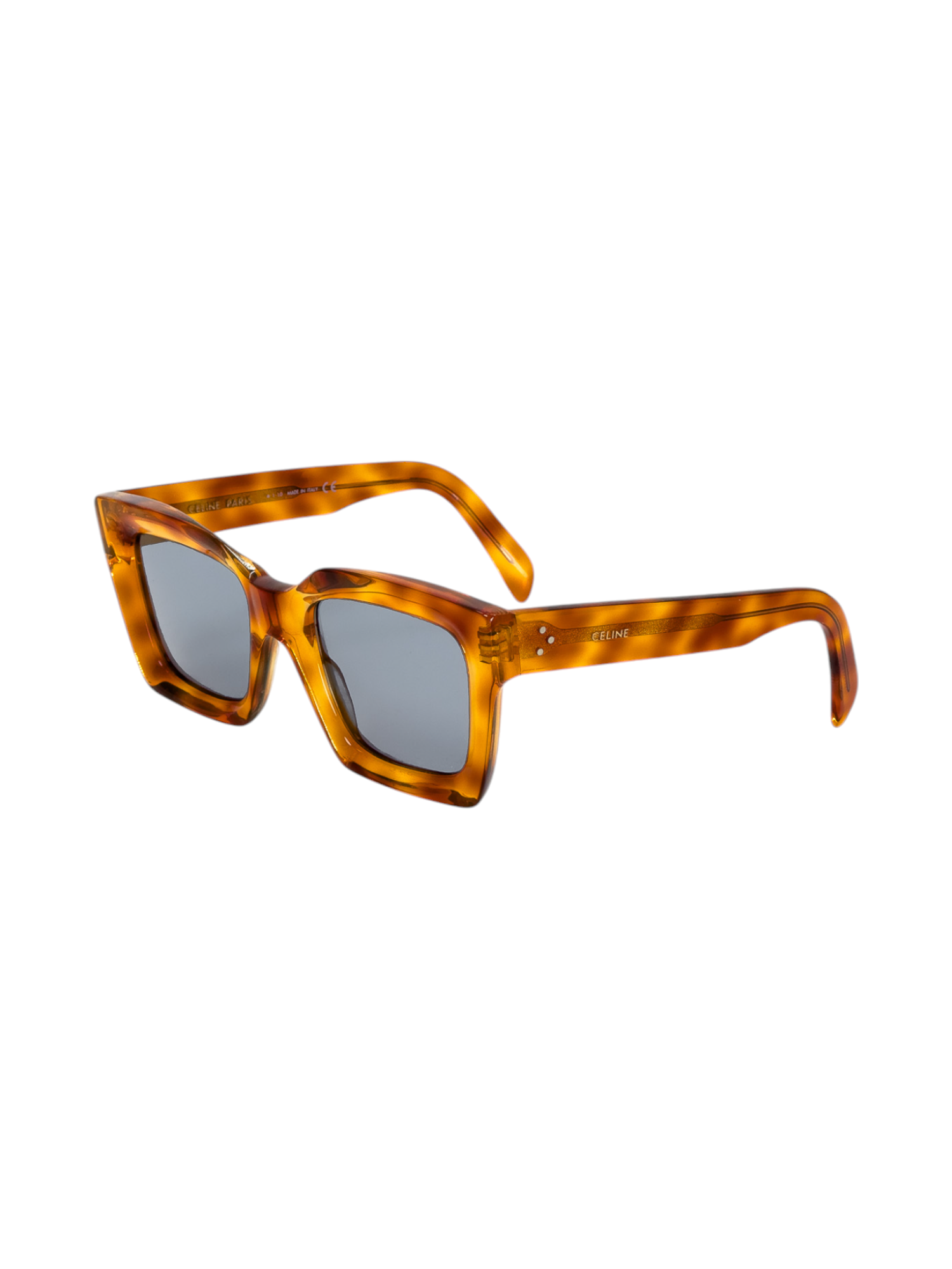 "Brązowo-pomarańczowe okulary przeciwsłoneczne, niebieskie, kwadratowe szkła, złote logo marki na oprawkach, etui w komplecie. Stan dobry, delikatne rysy na szkłach oraz oprawkach. Tworzywo sztuczne."