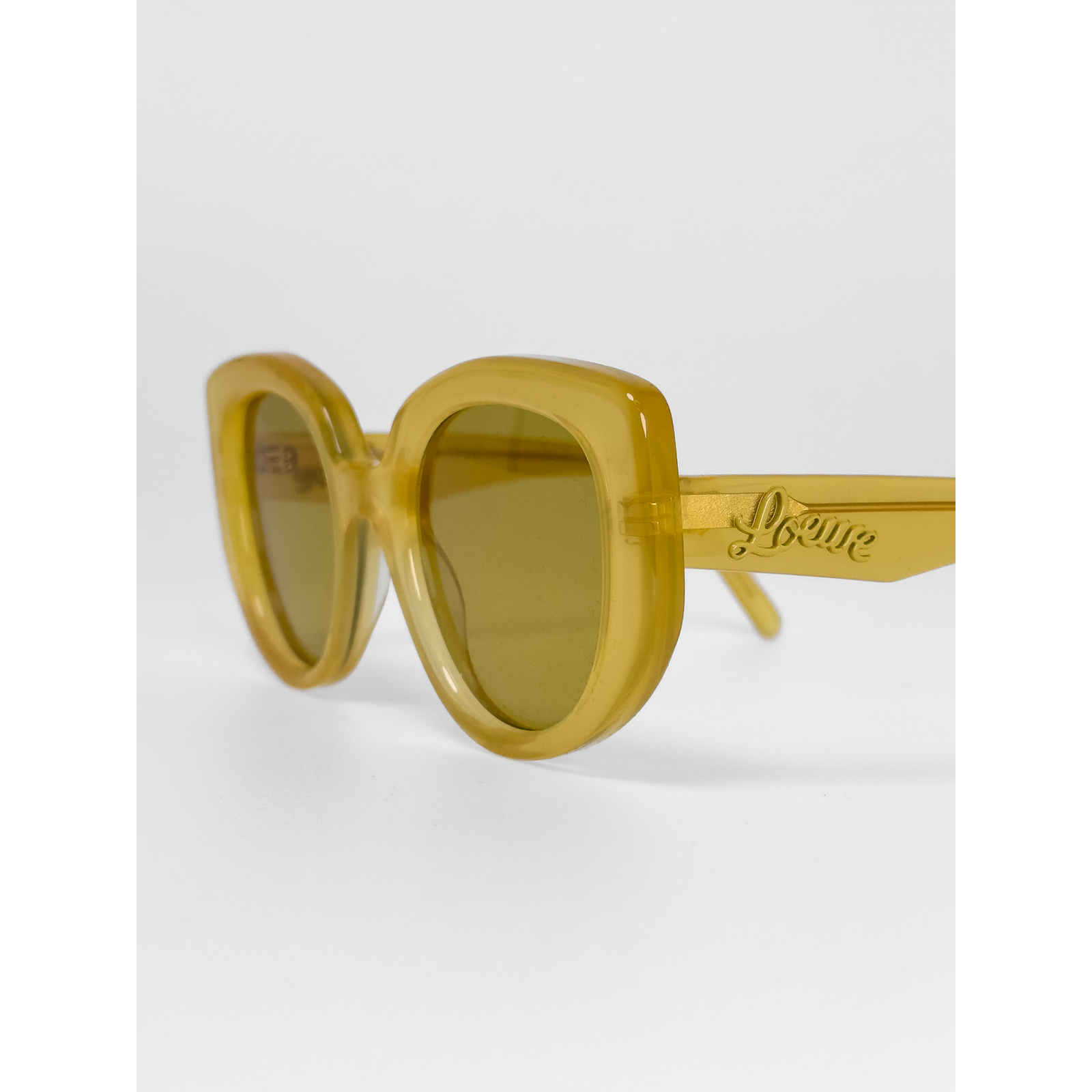 "Żółte plastikowe okulary przeciwsłoneczne, półtransparentne, zaokrąglone żółte szkła, logo marki na zausznikach, w zestawie z etui oraz ściereczką. Stan bardzo dobry."