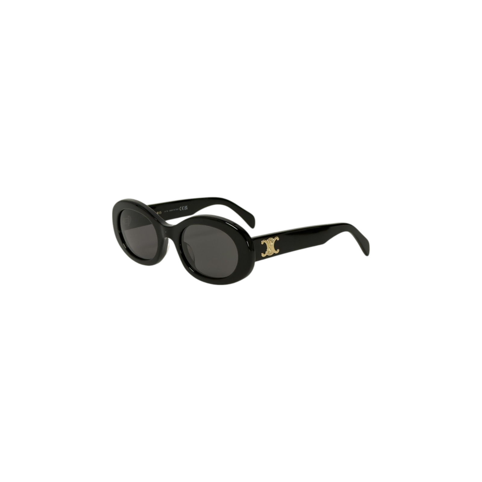 "Czarne okulary przeciwsłoneczne, owalne ciemne szkła, złote logo marki na zausznicach, w komplecie z brązowym etui oraz pudełkiem. Model: Triomphe 01 oval sunglasses. Stan bardzo dobry."
