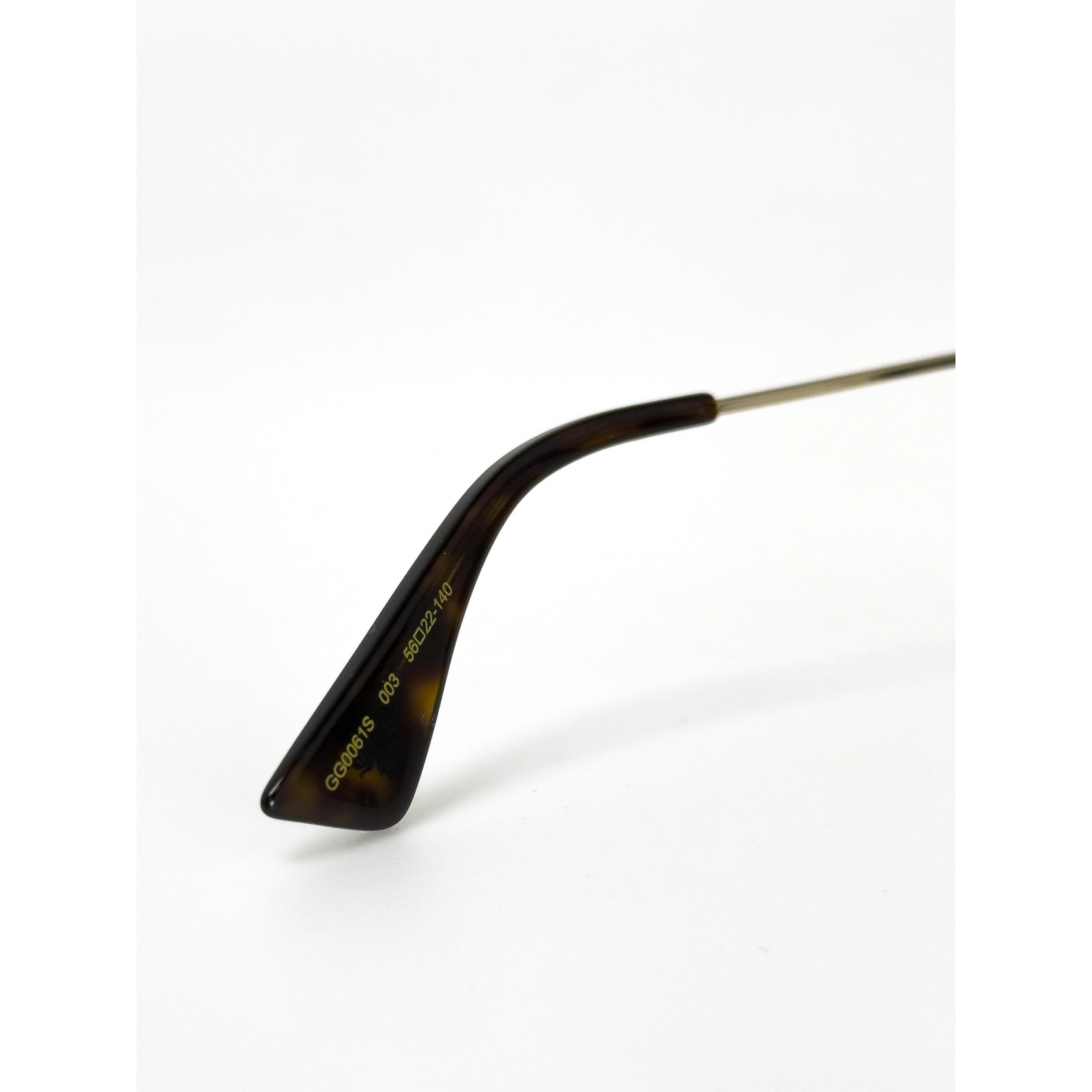"Okrągłe okulary przeciwsłoneczne, czarne cieniowane szkła, złote logowane oprawki ozdobione wstawkami w kolorach marki (czerwono-zielone), transparentne noski, szylkretowe wykończenia na zausznikach ze złotą grafiką pszczół, w zestawie z etui oraz woreczkiem. Stan bardzo dobry."