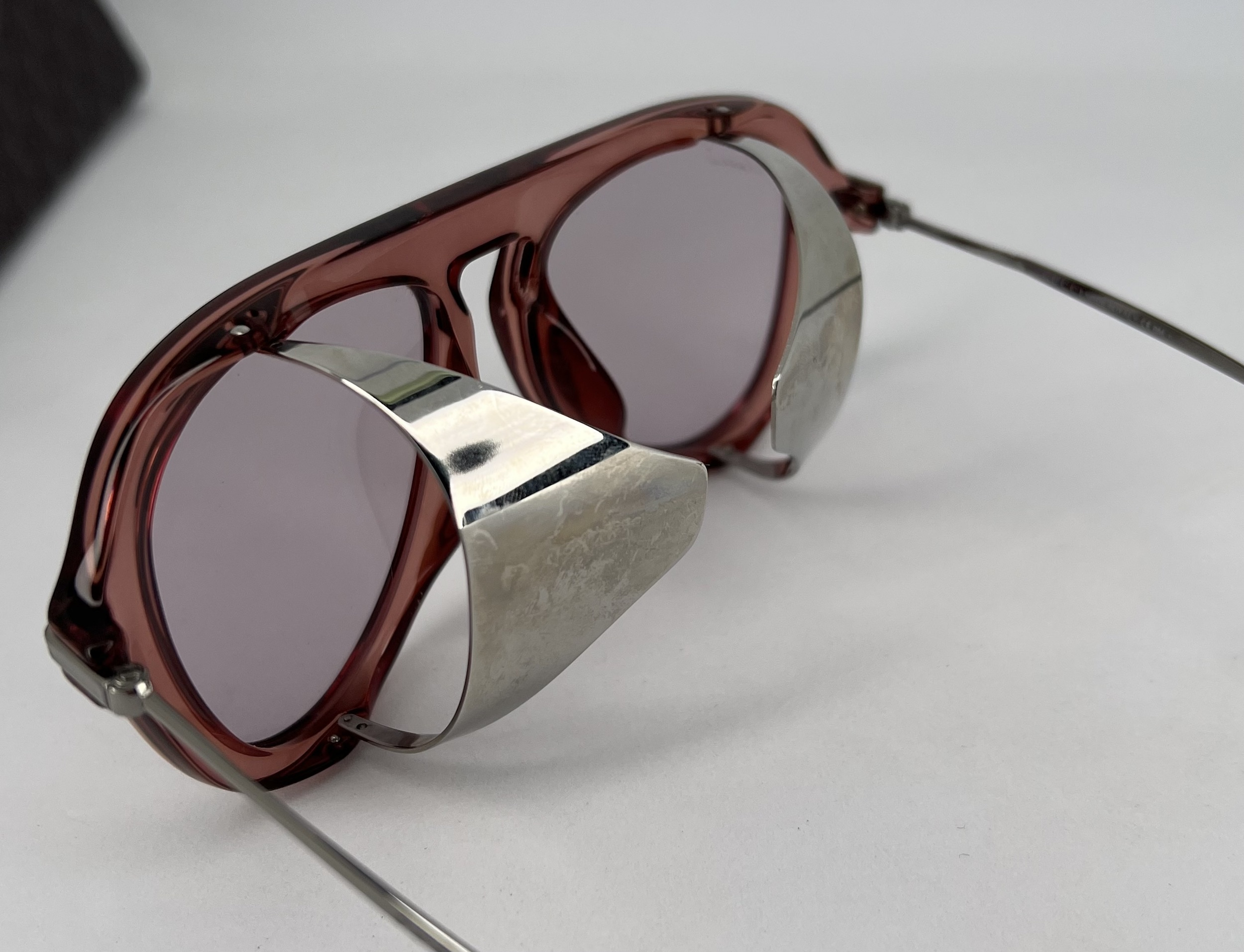 "okulary okrągłe w różowych transparentnych oprawkach, składane metalowe blaszki po bokach, srebrne cienkie zauszniki z logiem, używane, drobne ryski na szkłach, etui w zestawie."