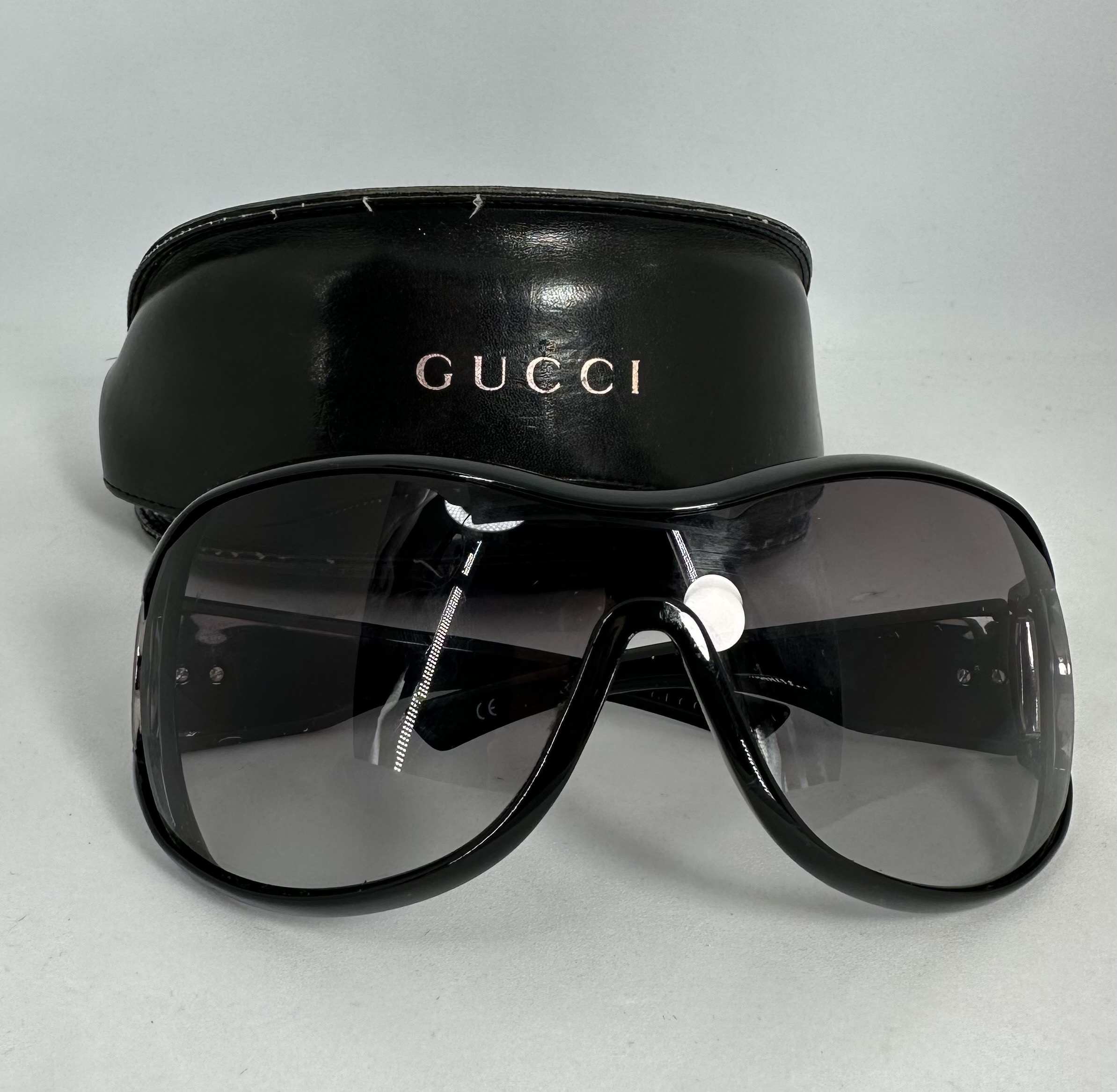 "czarne okulary przeciwsłoneczne, vintage, mocno zabudowane, plastikowe, elementy wędzidła i logo po bokach na nausznikach, porysowane, używane, z etui"