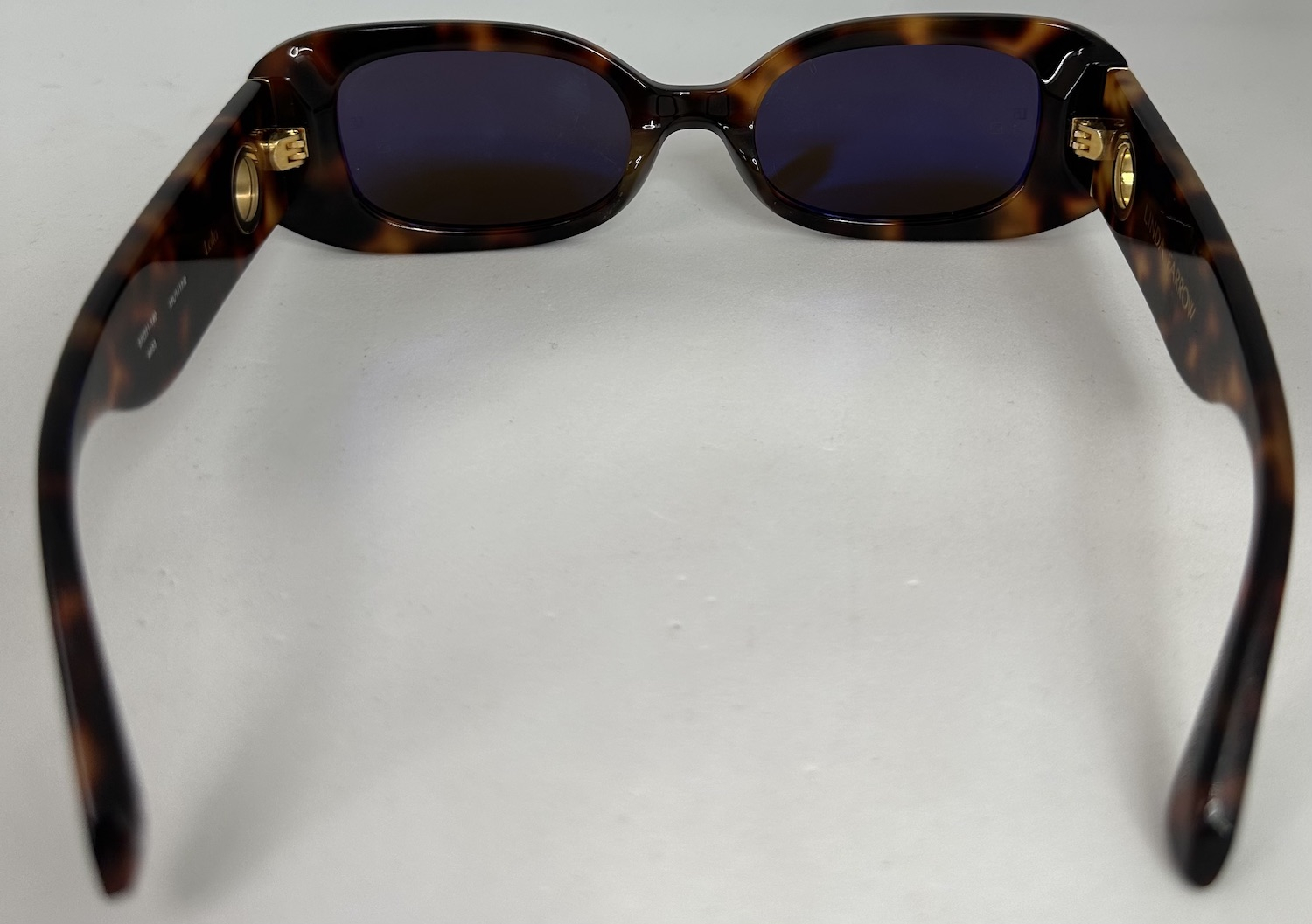 "okulary z podłużnymi szkłami, w panterkowych masywnych oprawkach, na zausznikach złote elementy z logowaniem, stan bardzo dobry, etui w zestawie."