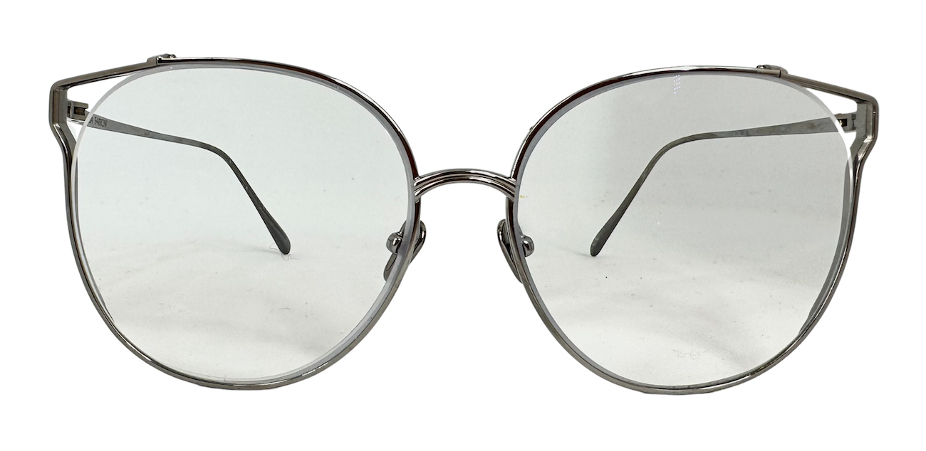 "okrągłe okulary w cienkich srebrnych oprawkach, logo po wewnętrznej stronie zauszników, szła opalizujące na niebiesko, używane, etui w zestawie, okulary korekcyjne z możliwością wymiany szkieł."