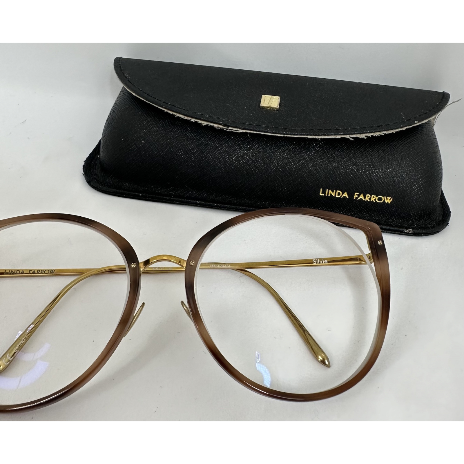 "okrągłe okulary, brązowo beżowe oprawki, złote zauszniki z logo po wewnętrznej stronie, opalizujące na niebiesko, używane, etui w zestawie, okulary korekcyjne z możliwością wymiany szkieł."