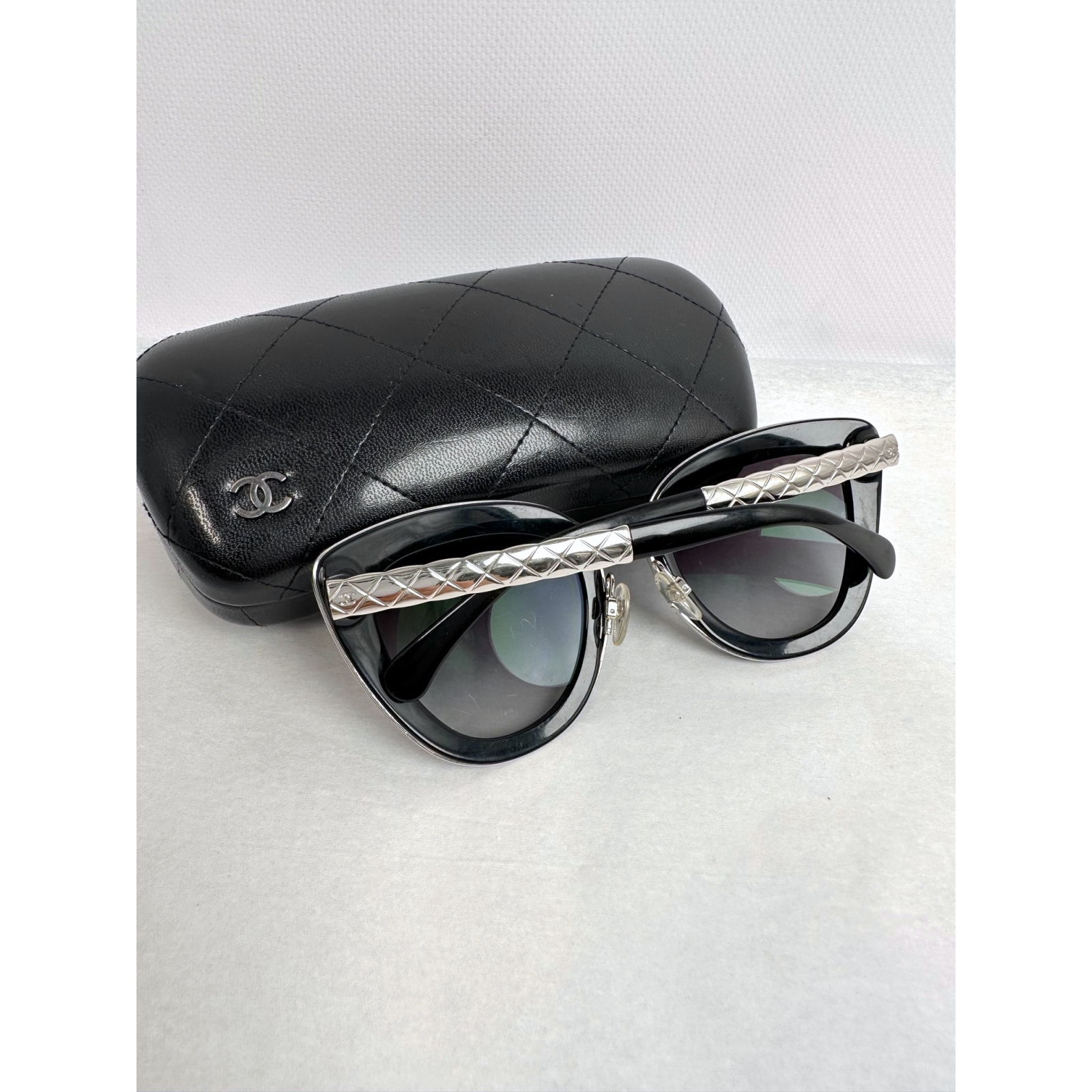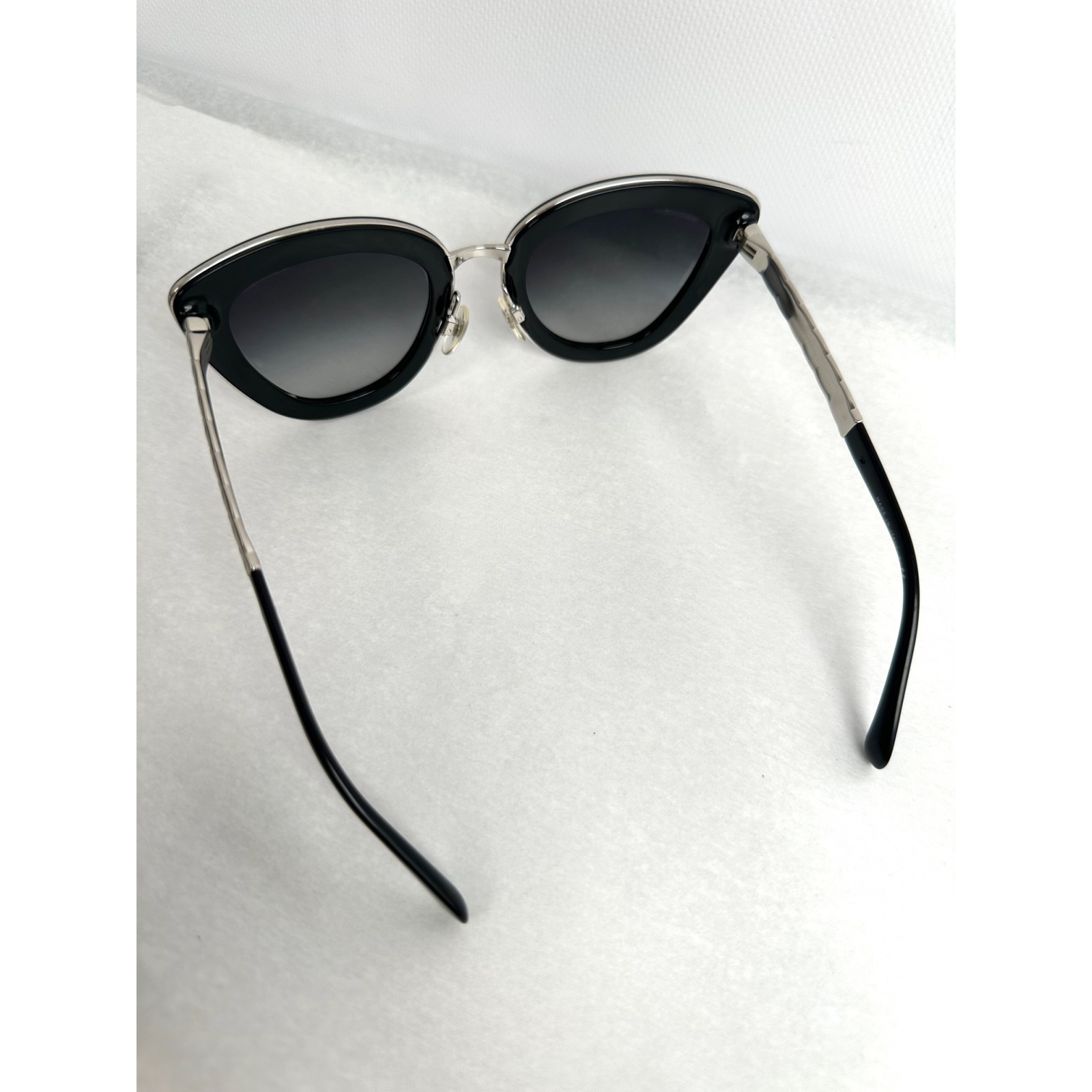 "czarne okulary w czarno srebrnych oprawkach, logo na szkłach oraz na zausznikach, etui w komplecie, używane, widoczne zarysowania na szkłach i oprawkach."