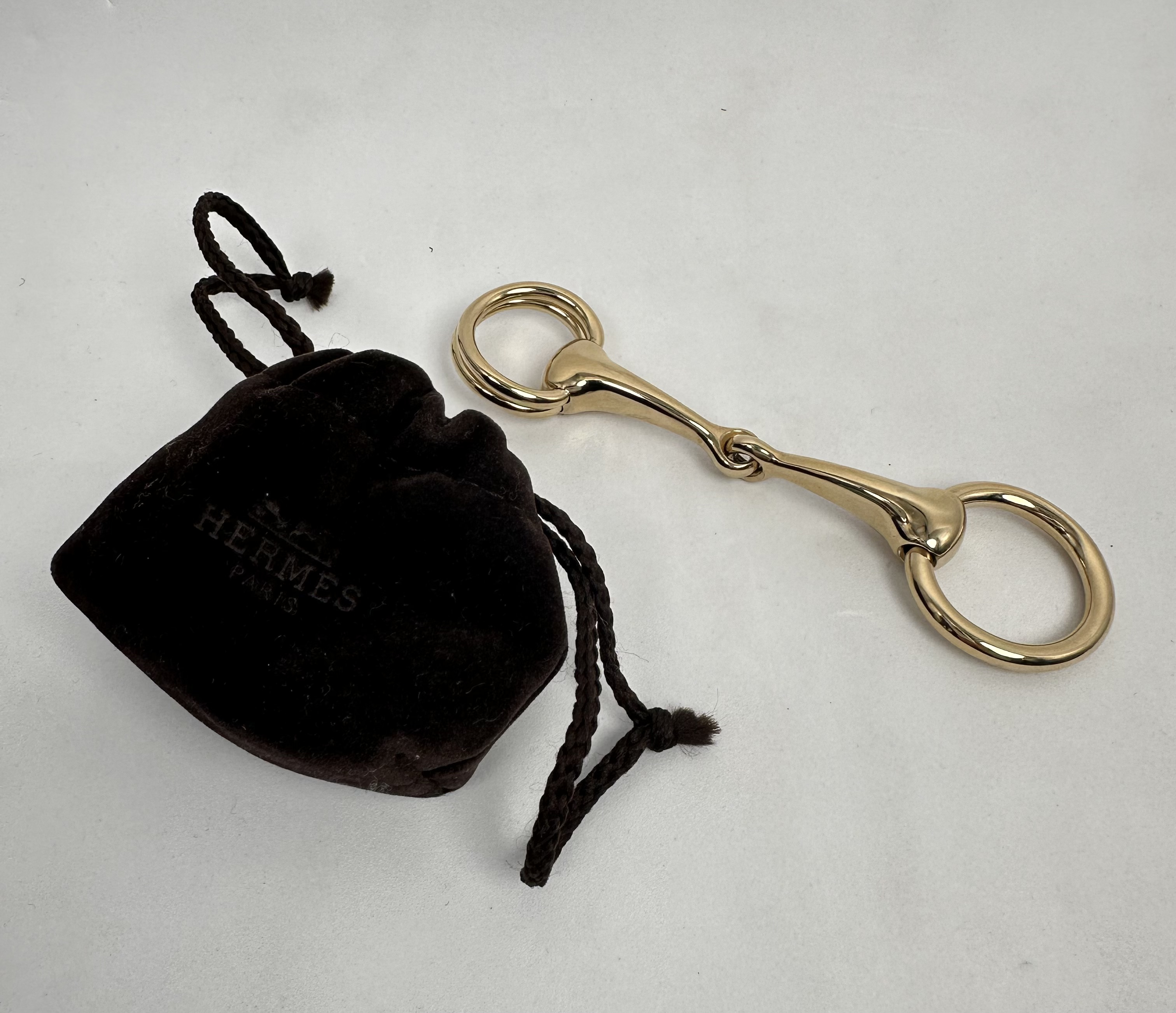 "Złote wędzidło, ozdoba apaszki, logo marki od wewnętrznej strony, w zestawie z workiem przeciwkurzowym, używane. Stan bardzo dobry, delikatnie porysowane. Wymiary: mniejsza średnica pierścionka: 2,3 cm, większa średnica pierścionka: 2,9 cm, szerokość: 10,8 cm."