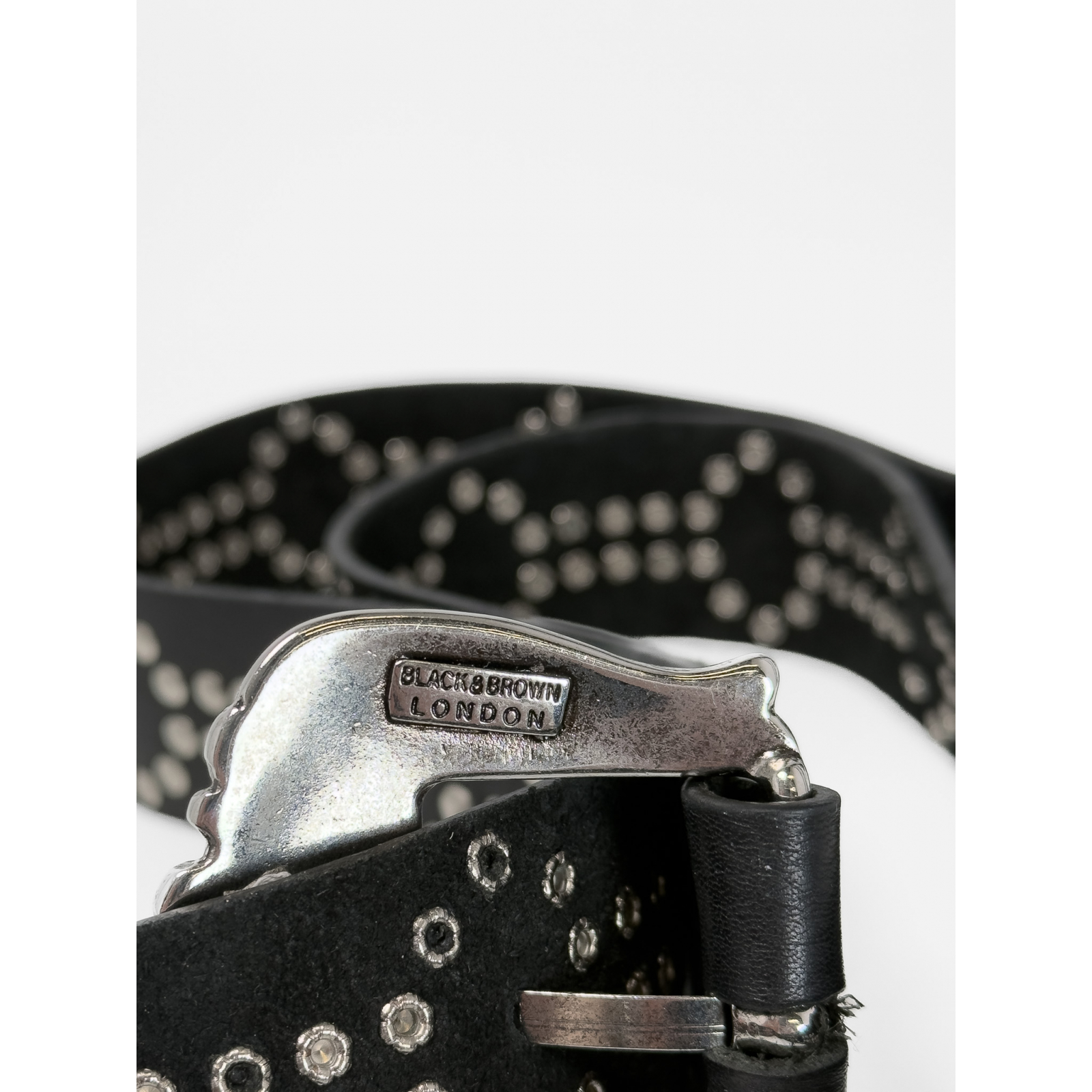 "Czarny skórzany pasek ozdobiony srebrnymi dżetami, logo marki na klamrze od wewnętrznej strony, miękka skóra."