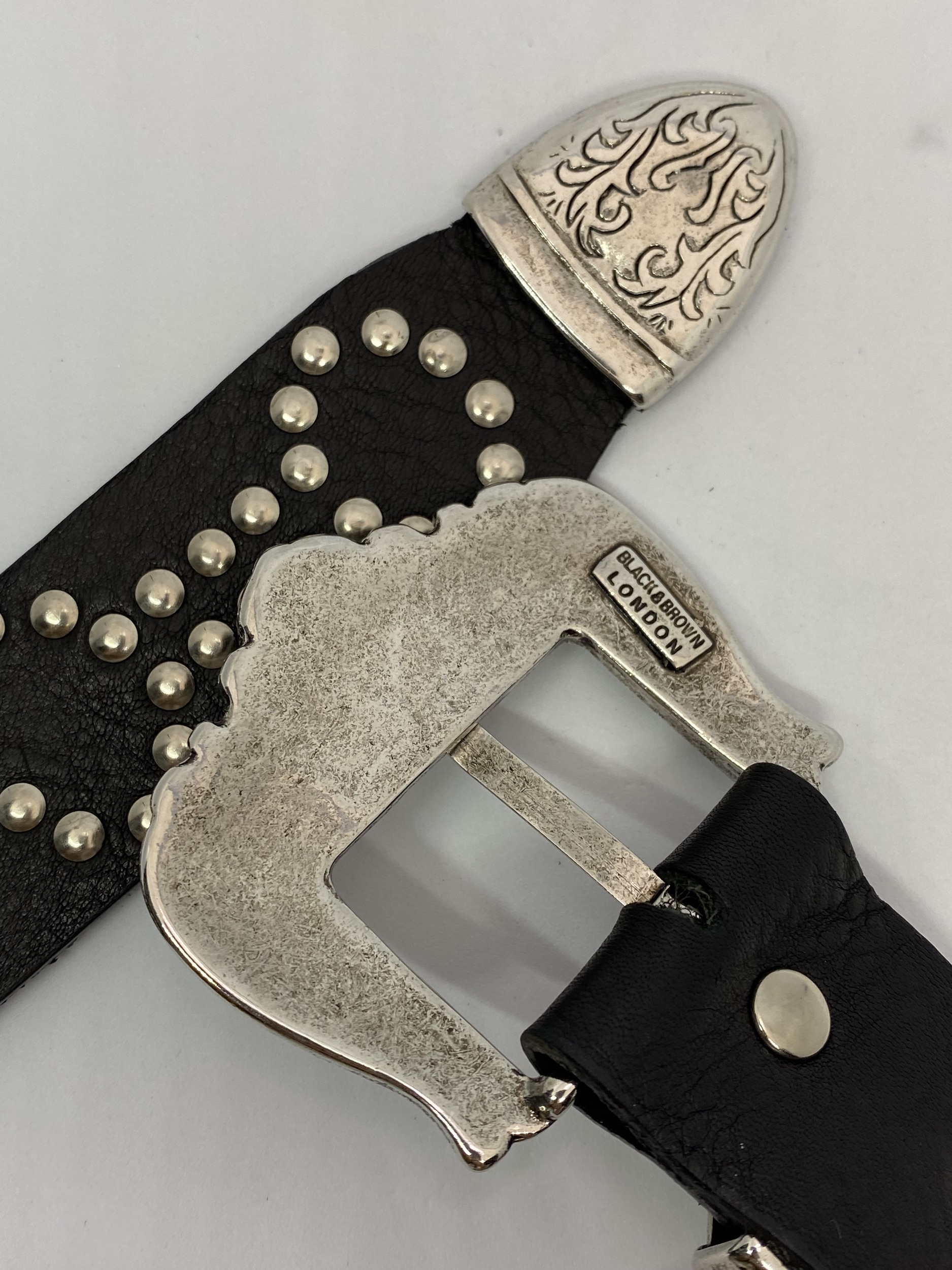 "czarny skórzany pasek z srebrnymi nitami po całości. Ozdobna klamra. Szer. 4 cm, dł 145 cm"