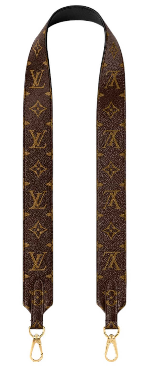 "Brązowy skórzany szeroki pasek do torebki w jasnobrązowy monogram marki, złote logowane okucia, czarny od wewnętrznej strony, w zestawie z pudełkiem oraz workiem przeciwkurzowym. Wymiary: szerokość 4cm, długość całkowita 97,5cm."