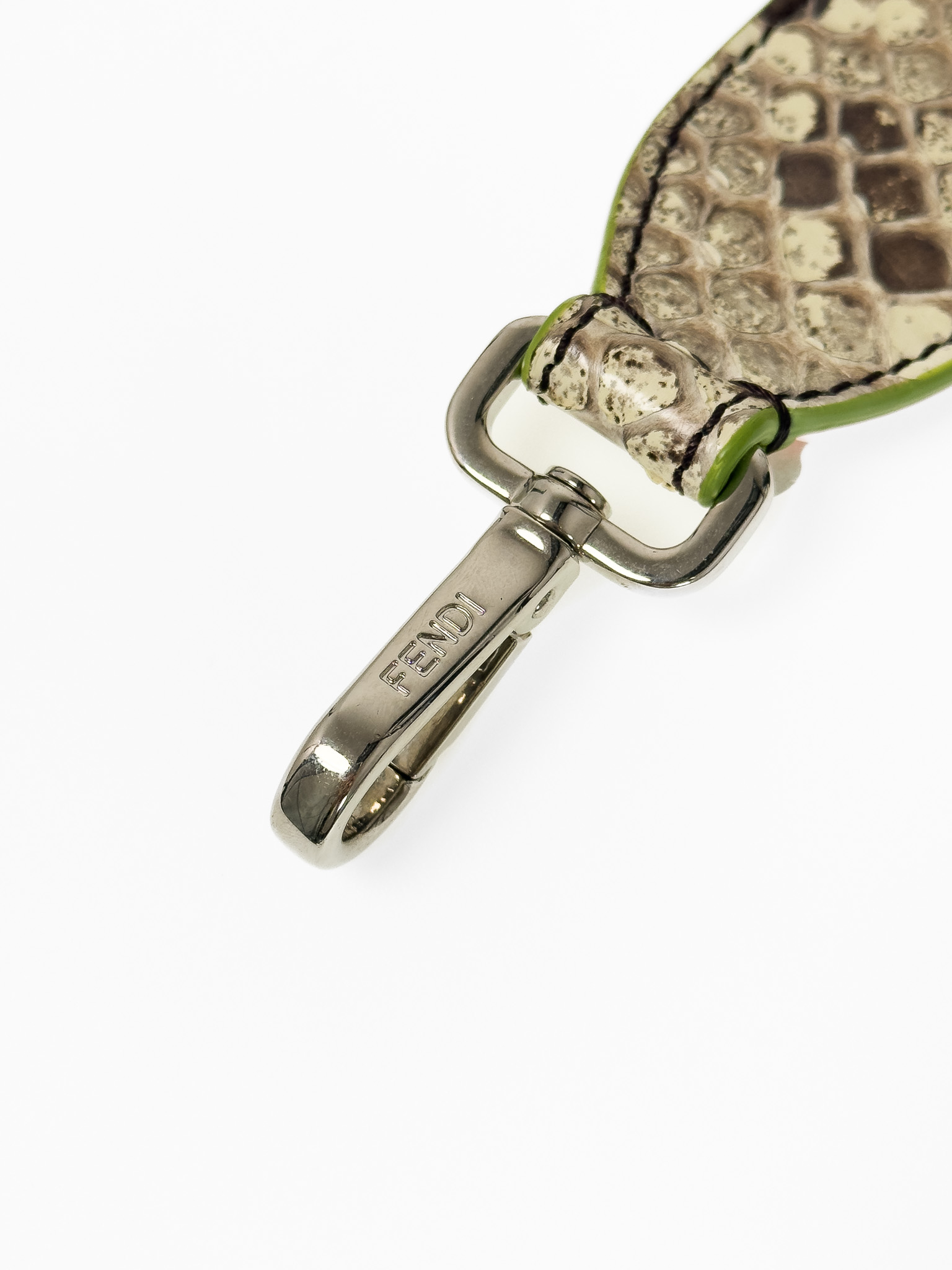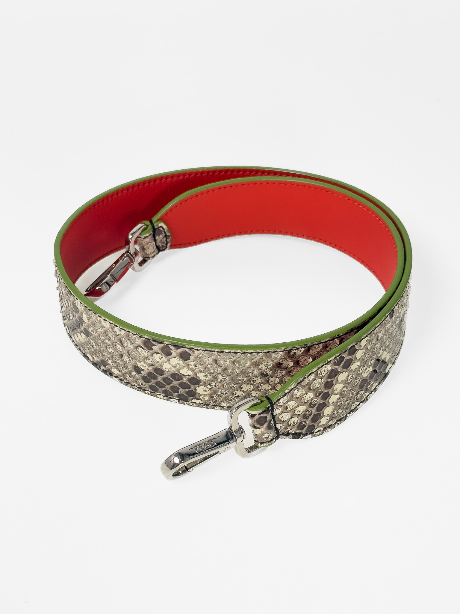 "Szeroki brązowo-kremowy skórzany pasek do torebki w motyw zwierzęcy, szeroki, wykończony dwoma srebrnymi logowanymi karabińczykami, czerwone skórzane wnętrze. Stan bardzo dobry."