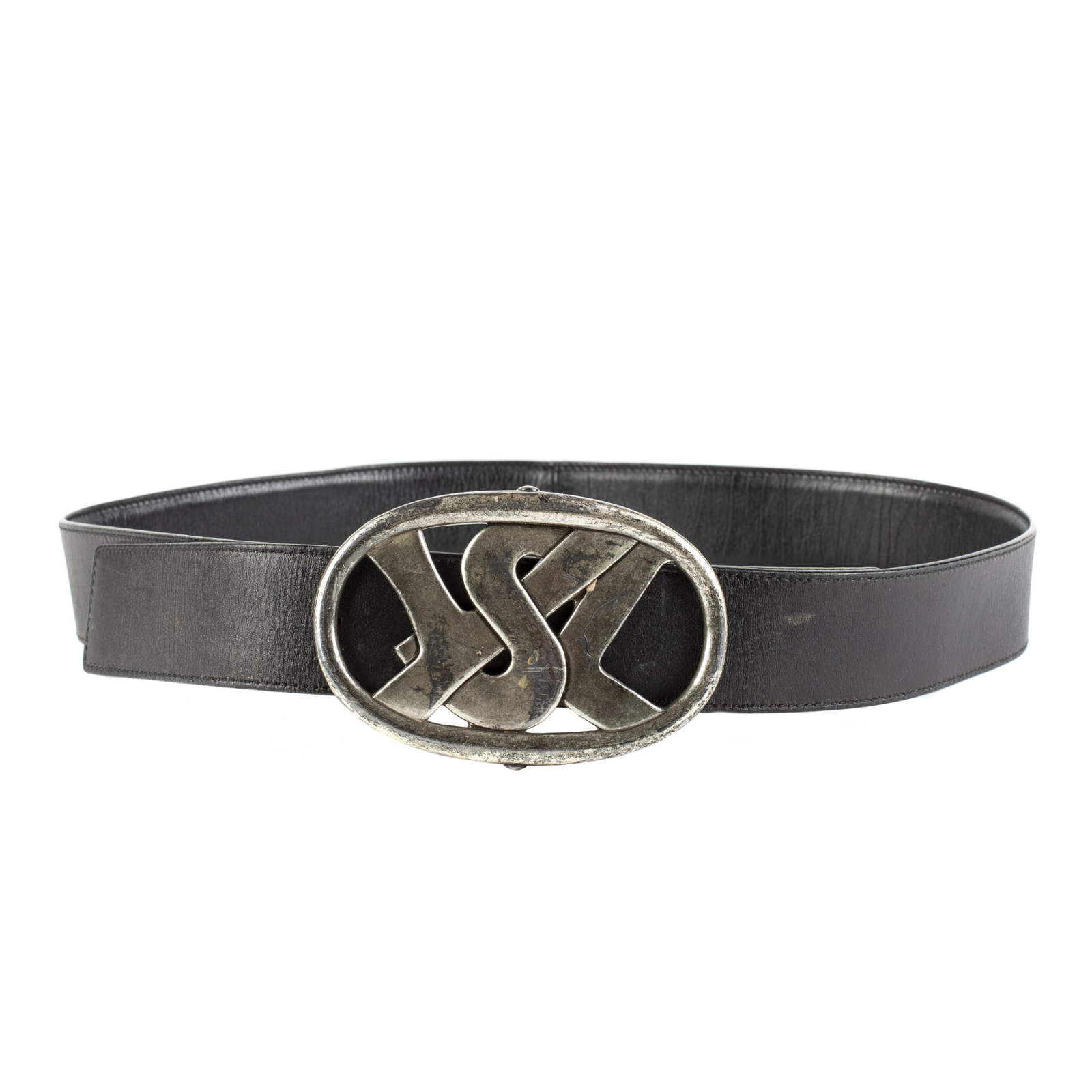 "czarny skórzany pasek z metalową, srebrną klamrą z logo