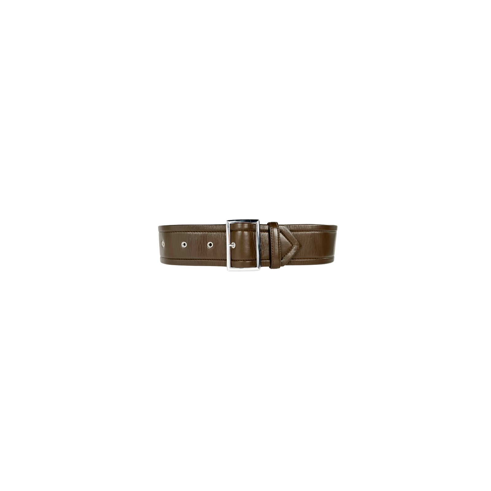 "Brązowy skórzany pasek, szeroki, srebrne okucia. Rozmiar 80. Wymiary: długość całkowita 104cm, szerokość 8cm."