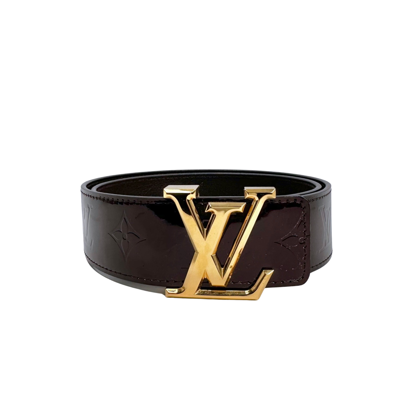 "Bordowy pasek z lakierowanej skóry. Na całej długości tłoczony w monogram. Jego krawędzie wykończone są głebokim stębnowaniem. Zapinany na dużą, metalową klamrę w kolorze złotym z zachodzących na siebie liter: "L" i "V". Skład: 100% skóra naturalna. Wymiary: szer.: 4 cm., dł. (mierzona do pierwszej dziurki:) 78 cm, dł. (mierzona do postatniej dziurki:) 87 cm"