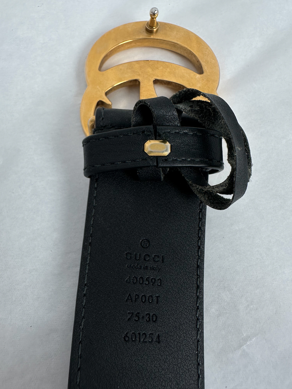 "Czarny pasek z złotym okuciem z logo marki. Klamra posiada rysy. Rozmiar 75. Pudełko w komplecie."