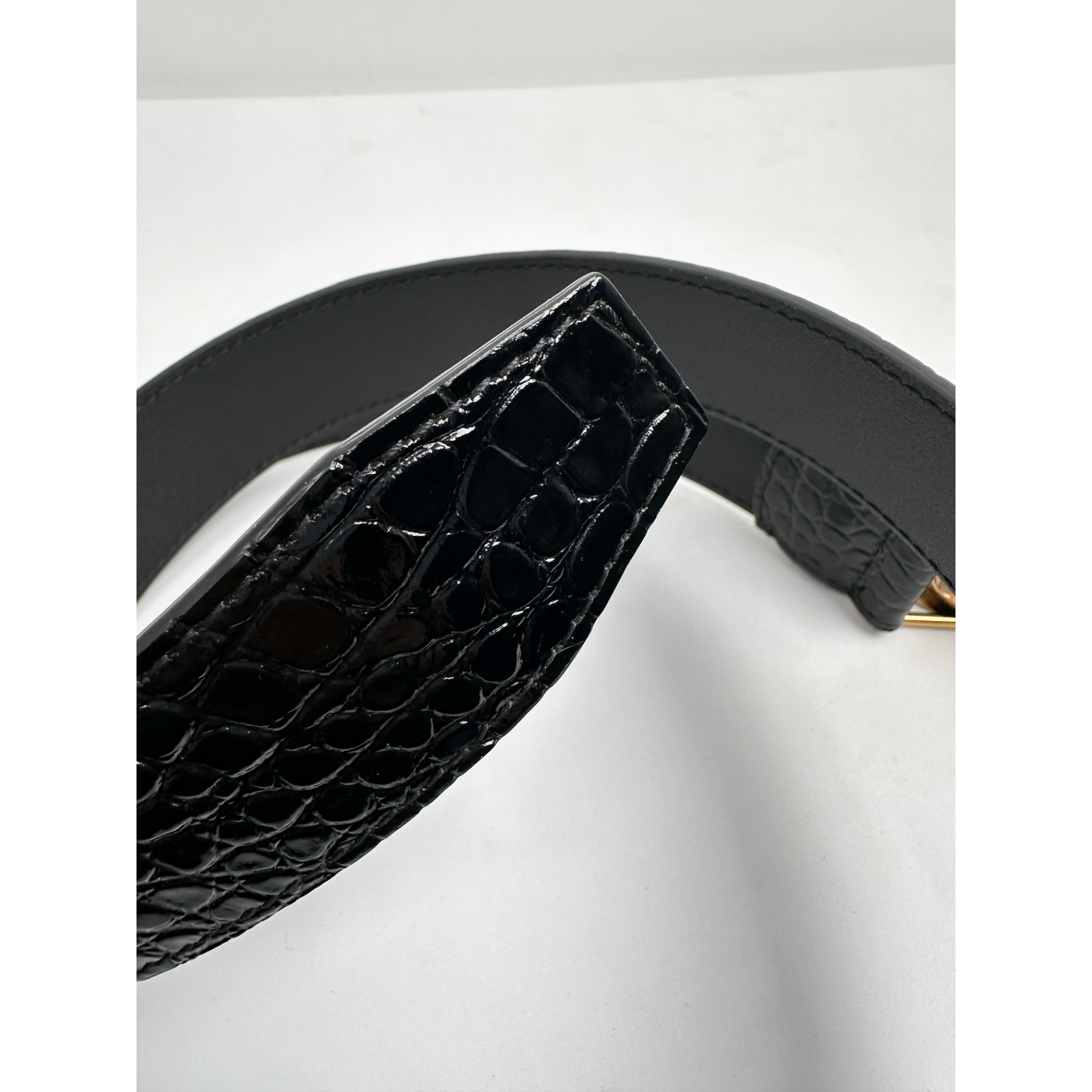 "Czarny skórzany błyszczący pasek w motyw zwierzęcy, ozdobiony dużą złotą matowa klamrą w kształcie litery "B" z logo marki, w zestawie z workiem przeciwkurzowym oraz pudełkiem. Stan nowy z metką. Rozmiar 85cm, szerokość 3,5cm."