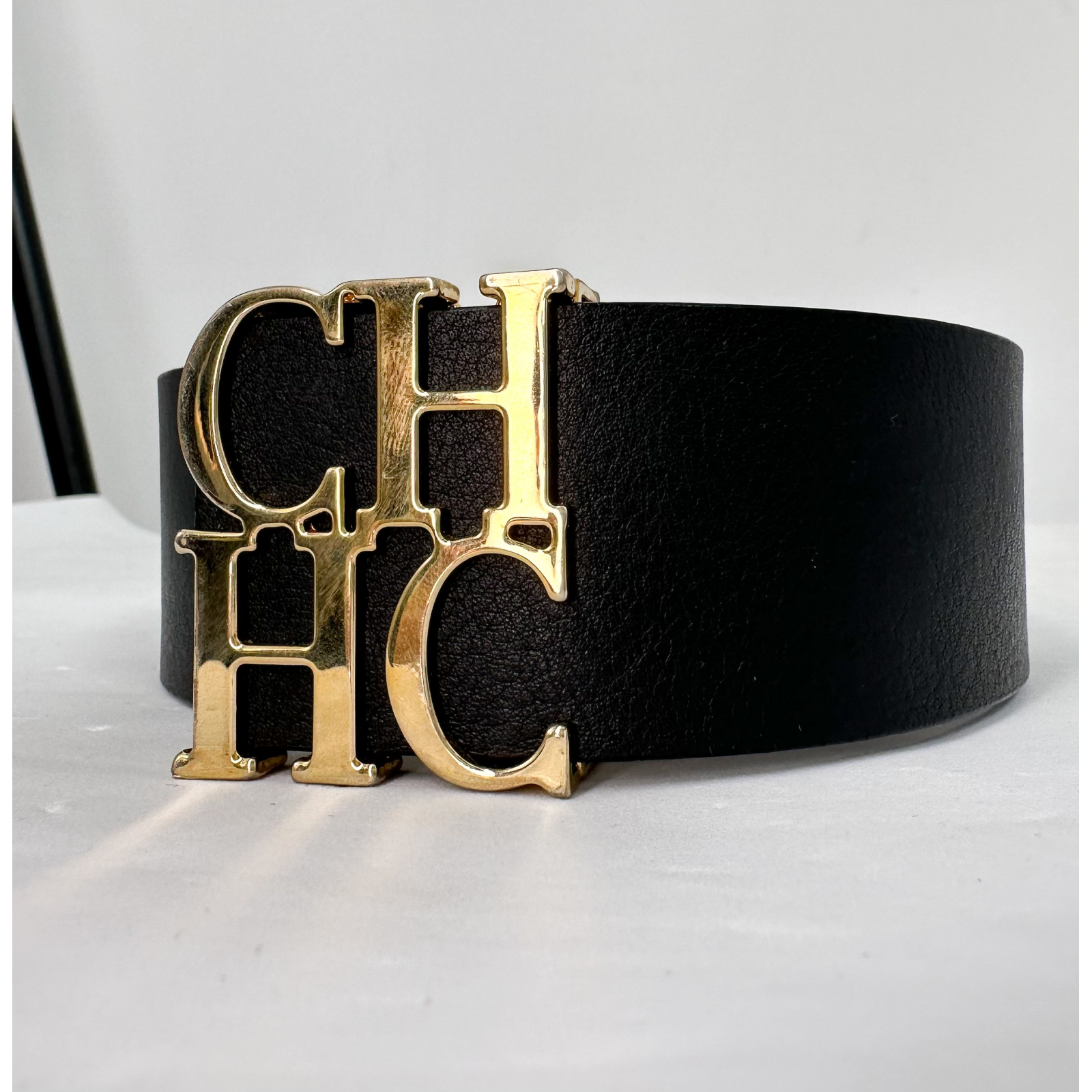 "Czarny skórzany szeroki pasek ozdobiony złotą klamrą z logo marki, cieliste wnętrze, używany. Stan bardzo dobry, delikatnie porysowane metalowe elementy oraz miejscowo zabrudzone wnętrze. Rozmiar 95."