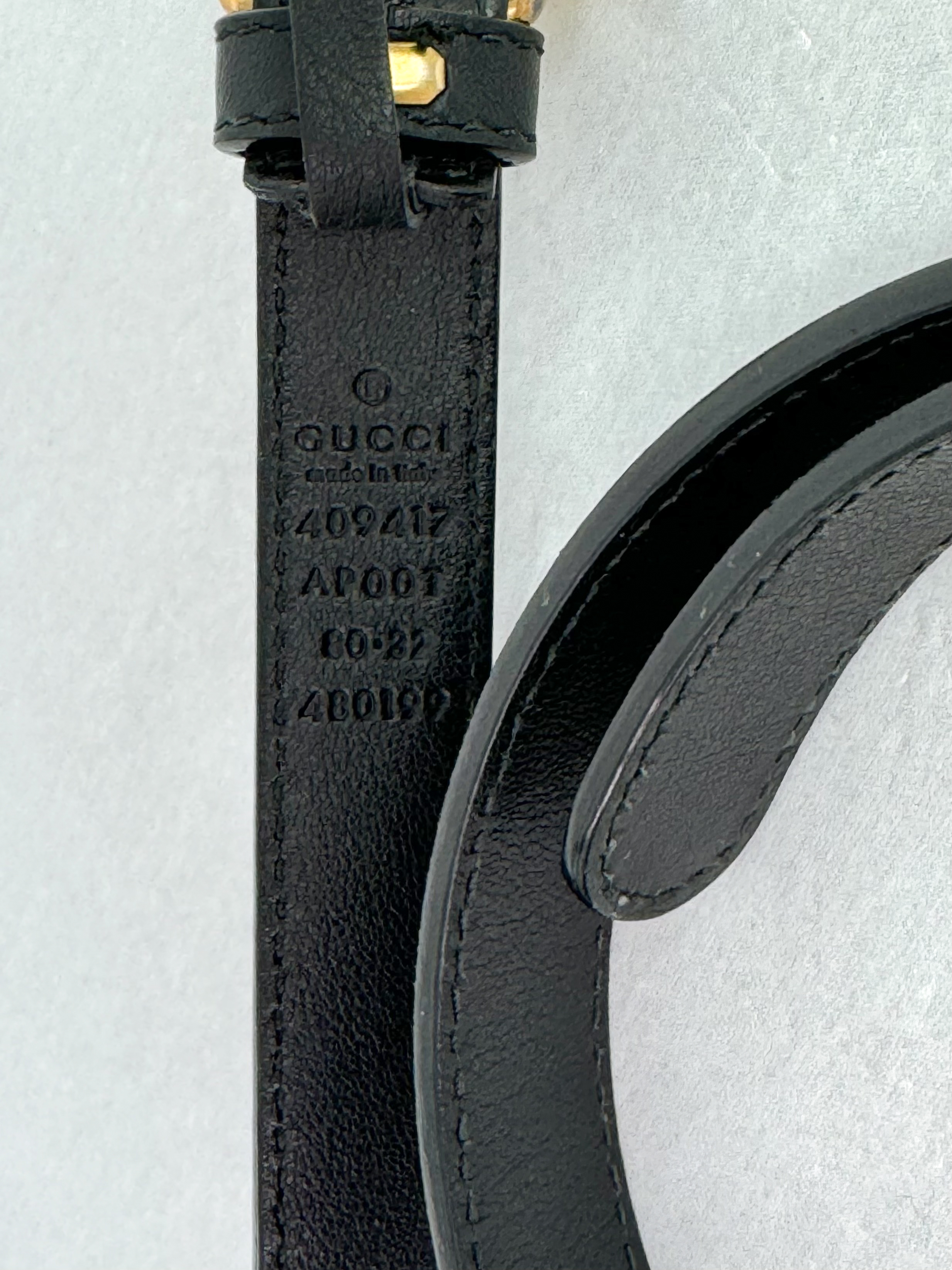 "Czarny skórzany pasek ozdobiony złotym zapięciem z logo marki, miękka skóra, cienki, używany. Stan bardzo dobry, delikatnie wytarty kolor na zapięciu. Rozmiar 80."