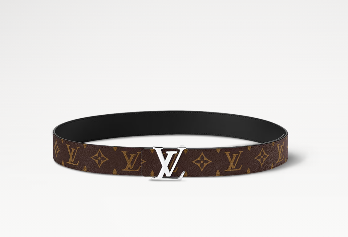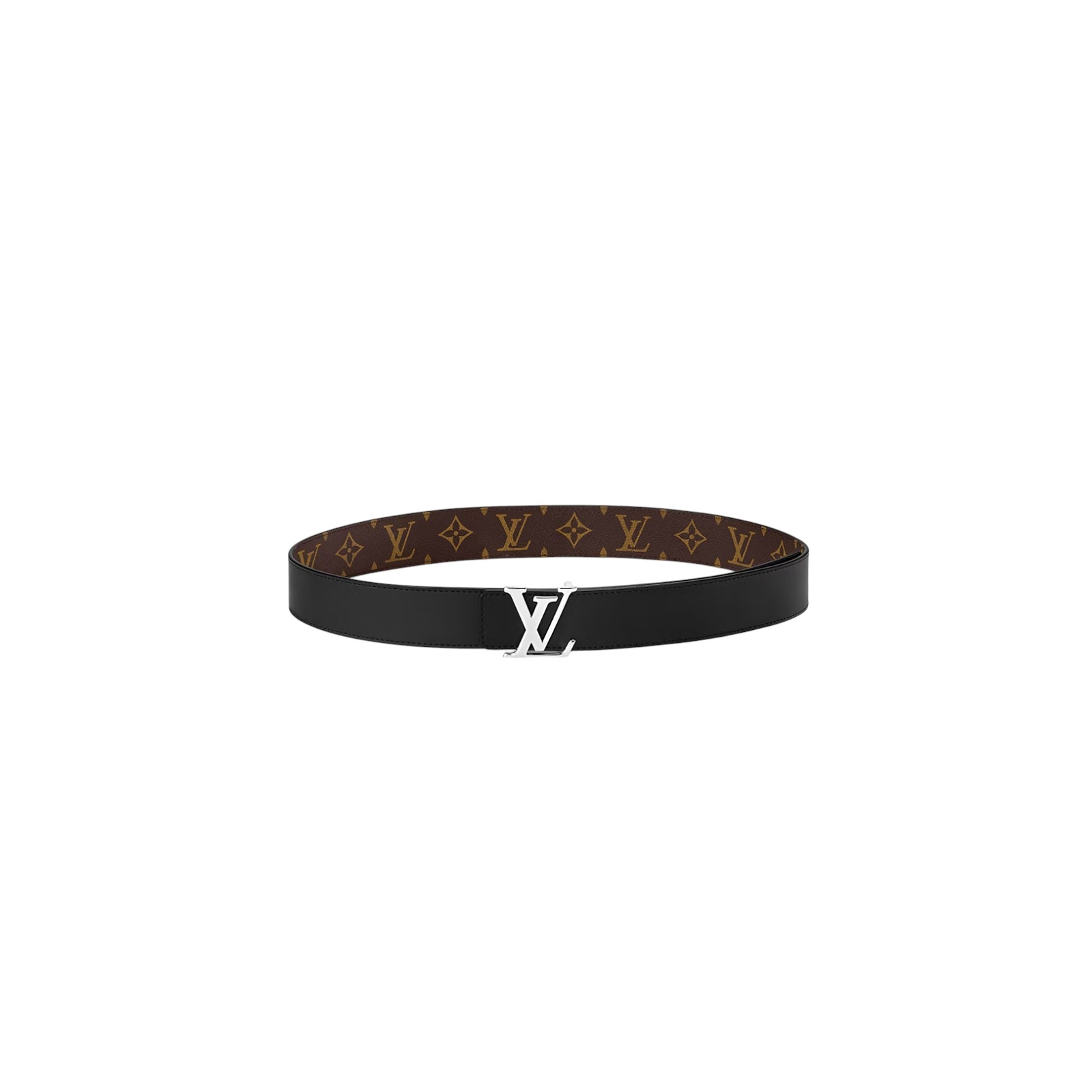 "Skórzany dwustronny pasek czarny/w brązowy monogram marki, czarna gładka skóra/groszkowa w monogram, duża połyskująca srebrna klamra z inicjałami marki, w zestawie z woreczkiem przeciwkurzowym oraz pudełkiem. Stan nowy. Rozmiar 90, szerokość 3,5 cm."