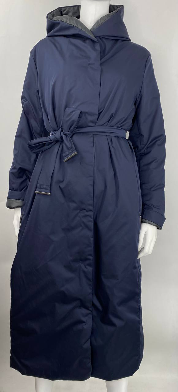 "płaszcz ocieplany, czarno granatowy, dwustronny z kapturem i z paskiem. Zapinany na suwak i zatrzaski. Rozmiar 50 (it)