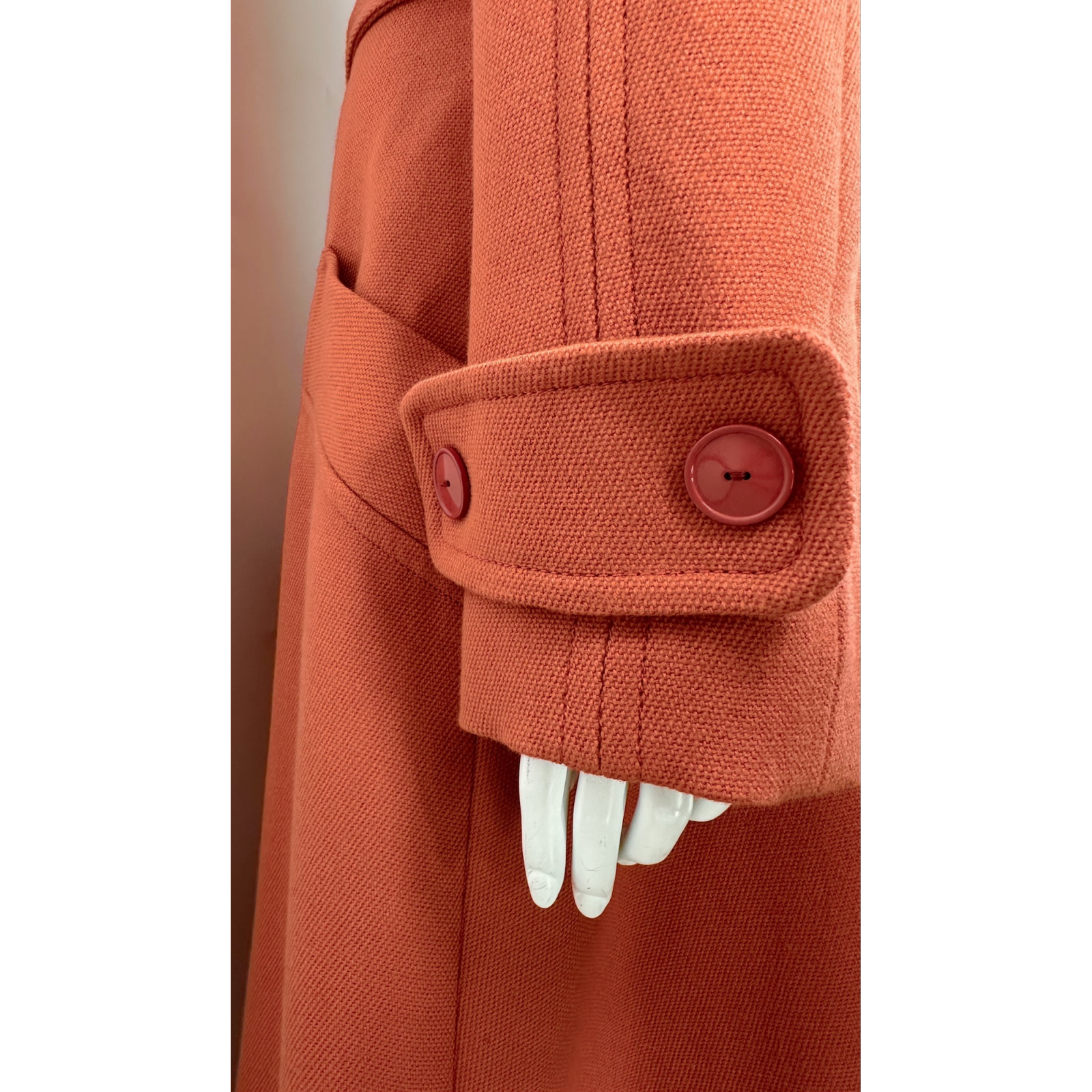 "pomarańczowy, długi płaszcz z paskiem, zaokrąglony kołnierz, zapinany dwurzędowo na guziki, nowy z metkami, rozmiar 42. Skład: 100% wełna. Wymiary: szer. ramion 45 cm, szer. biustu 49 cm, szer. talii 41 cm, dł. całkowita 115 cm, dł. rękawa 53 cm."