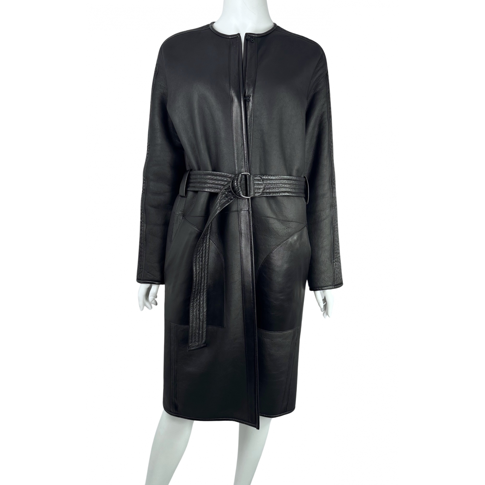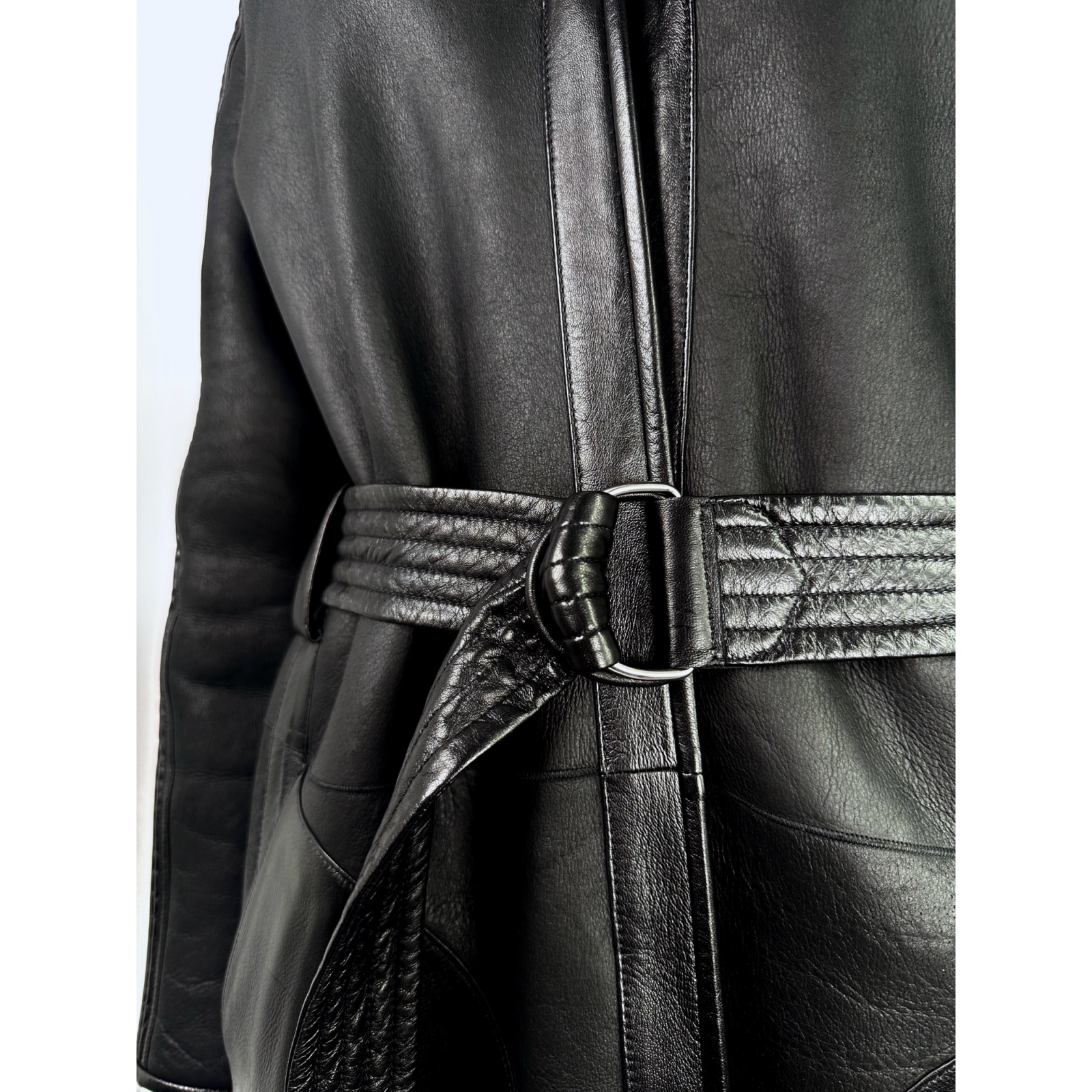 "Dwustronny, czarny kożuch. Zapinany jest na drobne, czarne haftki. Po obydwu stronach rękawów ma naszyte lampasy z marszczonej skóry naturalnej. Po bokach ma dwie, bardzo głębokie kieszenie. Po stronie skórzanej jest dodatkowo wzmocniony skórzanymi przeszyciami. Przewiązywany w talii paskiem z pikowanej skóry z klamrą w kolorze srebrnym. Kobiecie średniego wzrostu będzie sięgał za kolano. Stan: bardzo dobry. Skład: 100% skóra naturalna. Wymiary: dł. (mierzona od linii karku): 102 cm., szer. (mierzona od pachy do pachy): 52 cm, szer. rękawa (mierzona na wys. pachy): 22 cm., szer. (mierzona w pasie): 47 cm., dł. rękawa (mierzona od pachy): 47 cm. dł. paska: 140 cm., szer. paska: 5 cm."